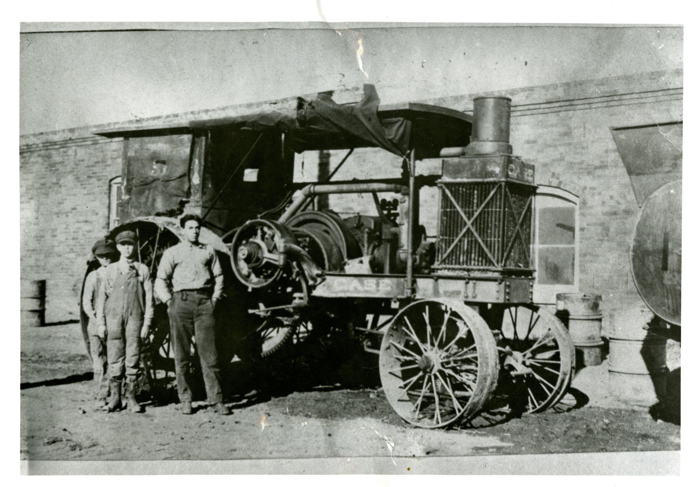 Front: Black and white photograh with two boys on the left side of the picture standing next to a man, F.W. Hunter. In the background is a brick building. Behind the men is the "Big Case Engine Tractor" which was used for graveling roads.