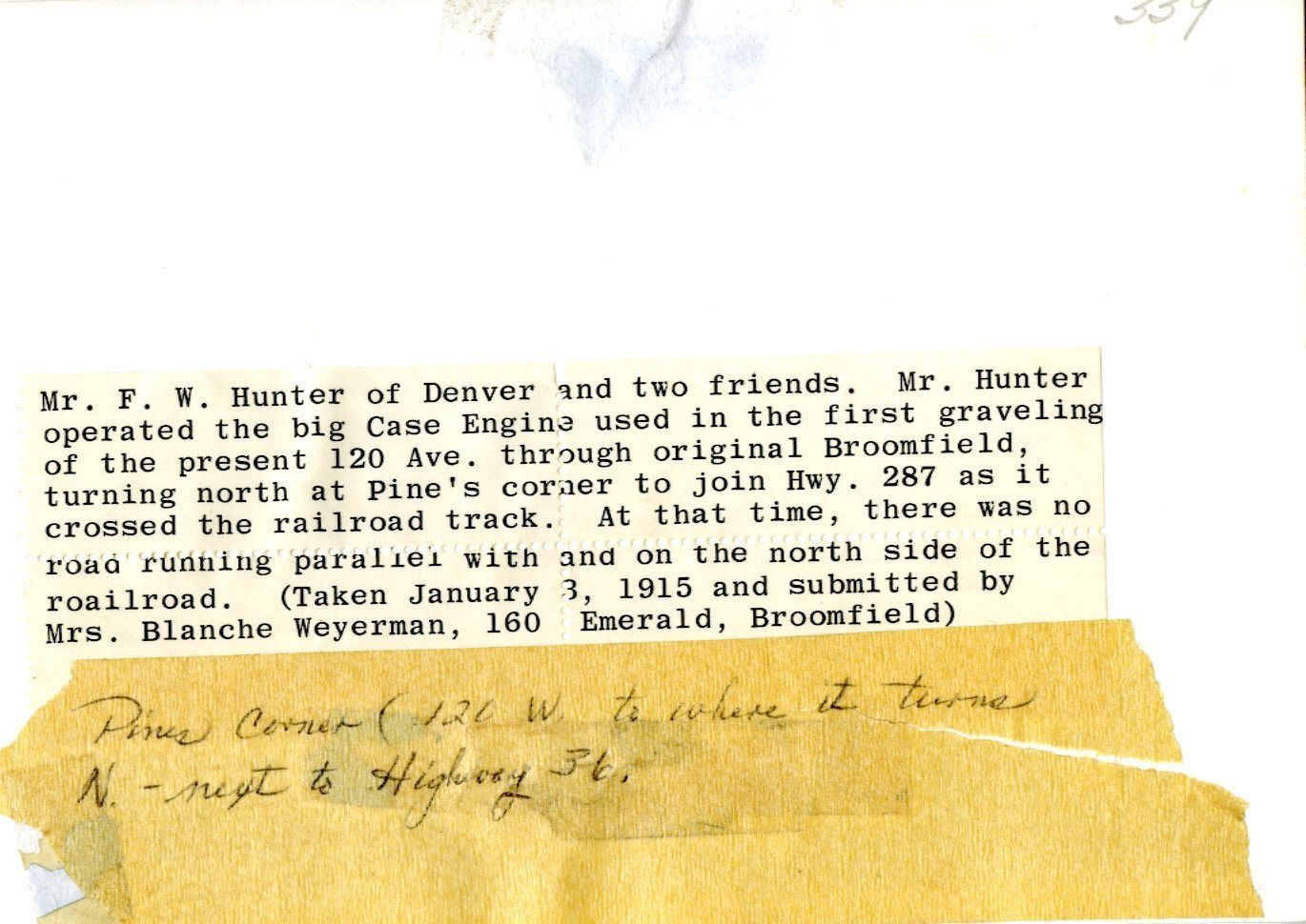 Printed on back in black text: "Mr. F.W. Hunter of Denver and two friends. Mr. Hunter operatied the Case Engine used in the first graveling of the present 120 Ave. through oringinal Broomfield, turning north at Pine's corner to join Hwy. 287 as it crossed the railroad track. At that time, there was no road running parallel with (?)and on the north side of the roailroad. (Taken Januray 3, 1915 and submitted by Mrs. Blanche Weyerman, 160 Emerald, Broomfield)"