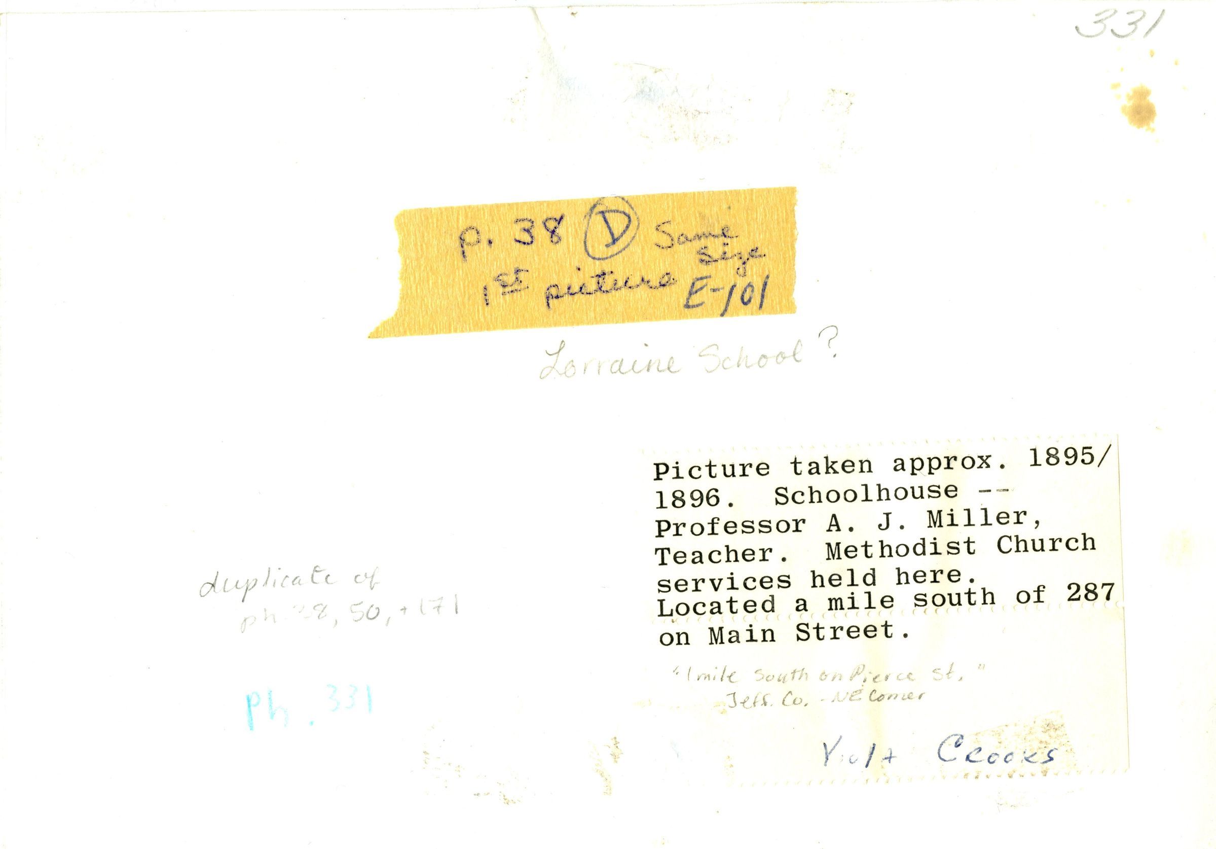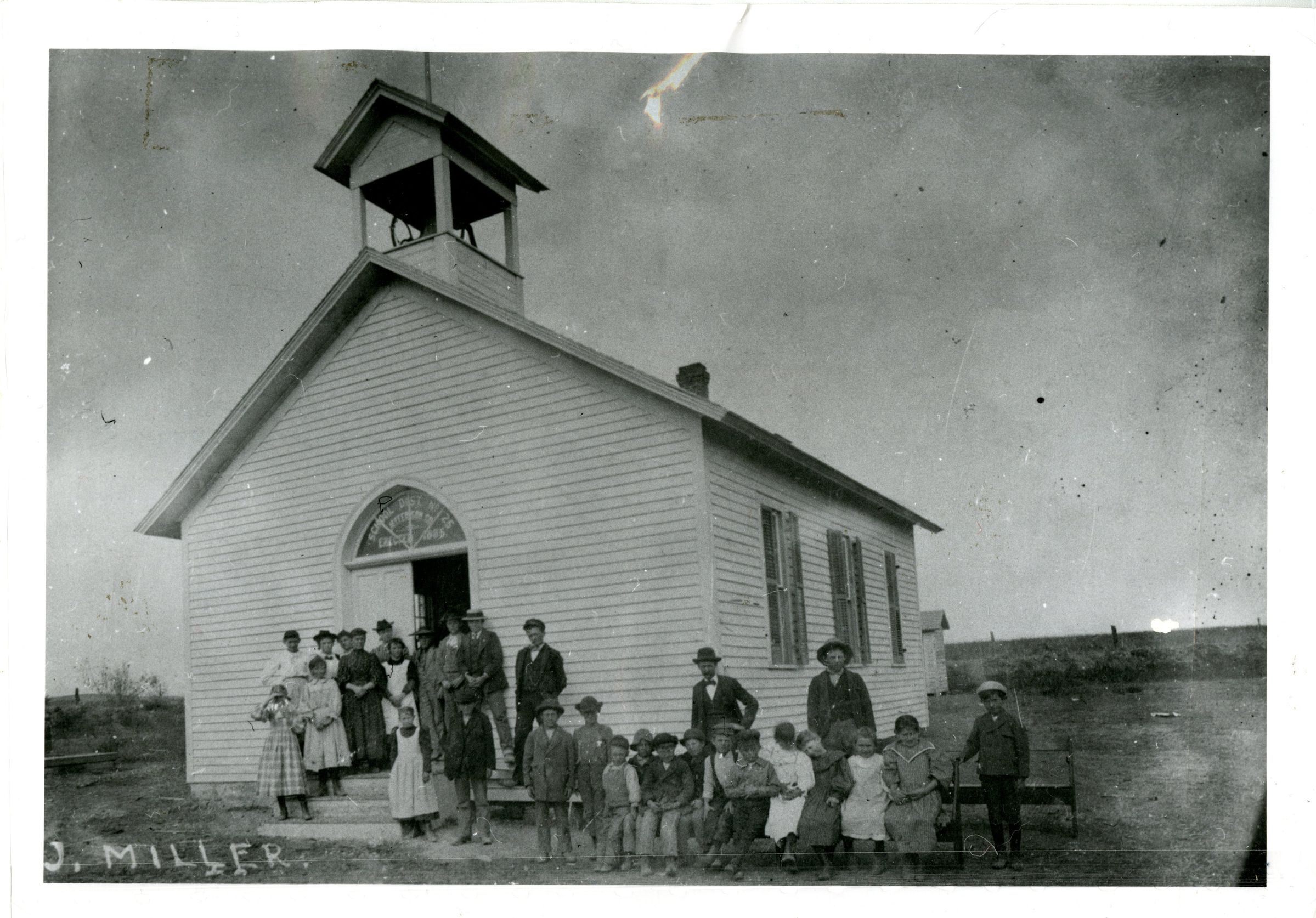 A group of adults and children stand in front of a single room building with a bell tower in front and chimney in back. 10 children sit on bench. Text on glass above the door in the front reads SCHOOL DIST NO 25 ERECTED 1885. Handwritten name in bottom-left corner is J. Miller. Photo taken at an angle to the building. Typed text on back reads "Picture taken approx. 1895/1896. Schoolhouse -- Professor A. J. Miller, Teacher. Methodist Church services held here. Located a mile south of 287 on Main Street." Handwritten note reads "'1 mile south on Pierce St.' Jeff. Co -NE Corner. Viola Crooks"