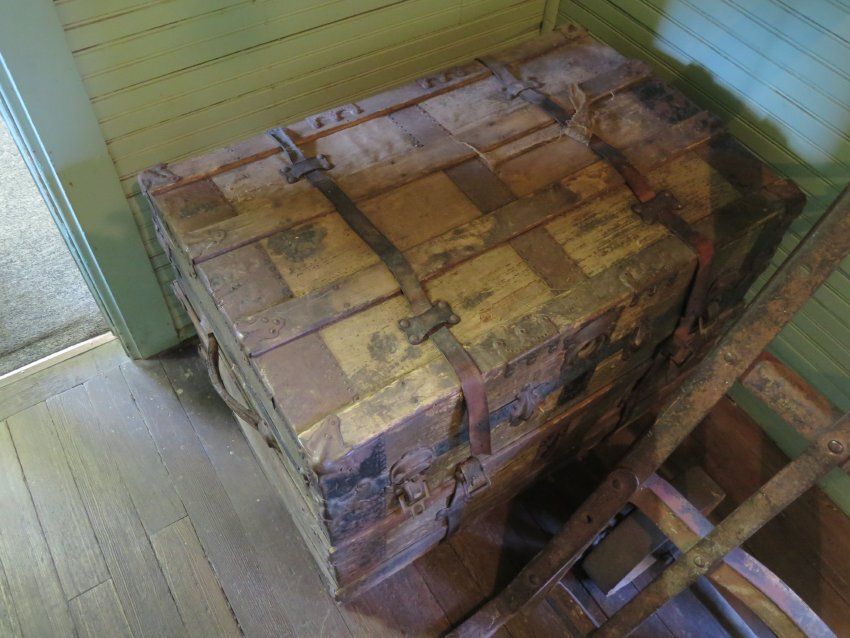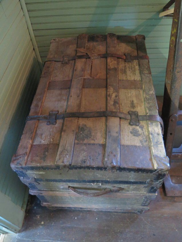 From label found in trunk "Ready Access Trunk Pat. 1904 A giant suitcase for traveling, a chest of drawers when you got there!! Listed in turn of the century Sears Roebuck Catalog for $7.50 - canvas covered wood with steel corners."