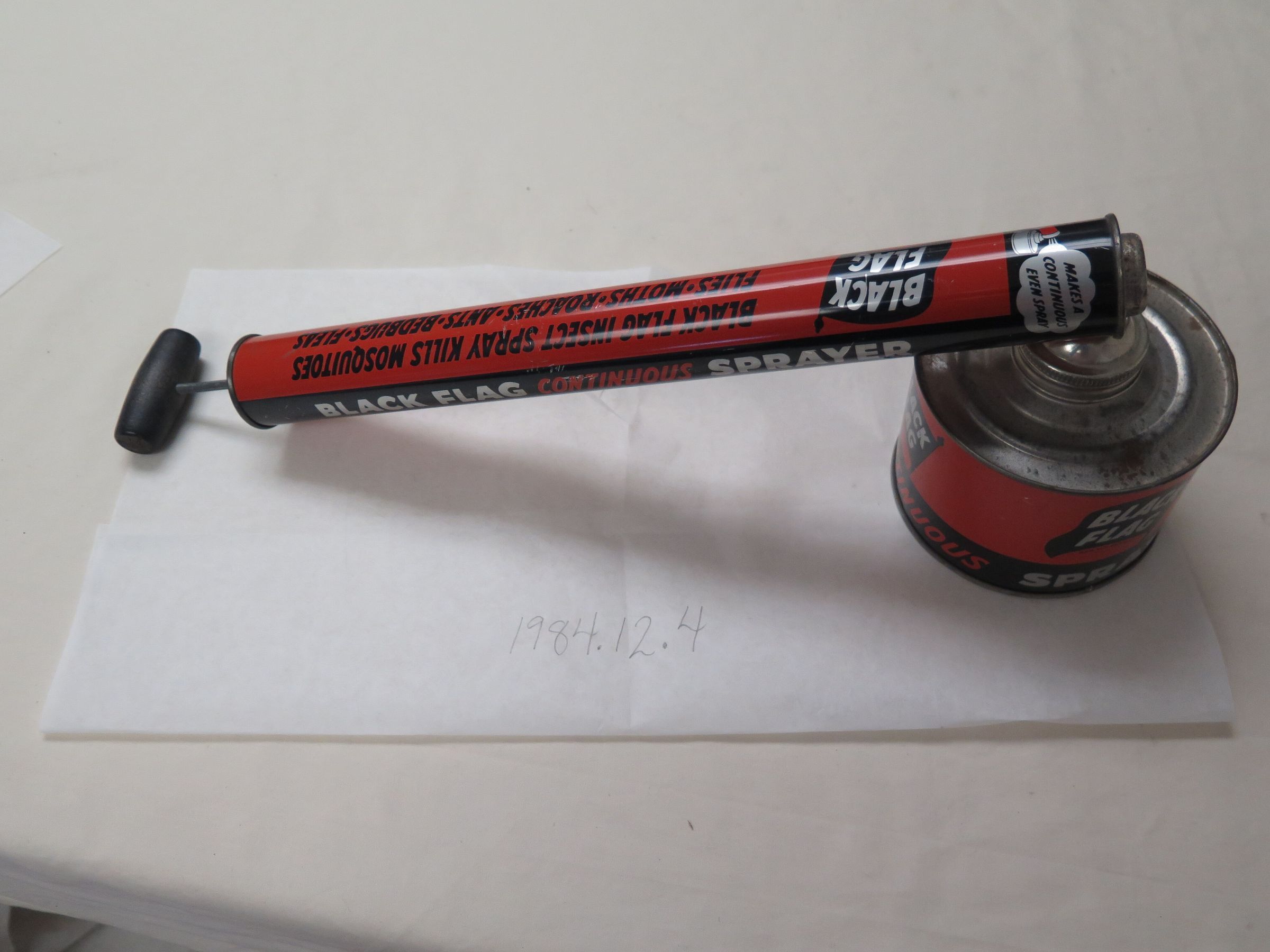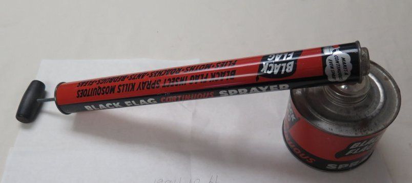 This is a Black Flag continuous sprayer can for killing insects. The can is black and red and reads "BLACK FLAG INSECT SPRAY KILLS MOSQUITOES, FLIES, MOTHS, ROACHES, ANTS, BEDBUGS, FLEAS". The sprayer measures 5.5" (h) x 5.5"(dia) x 16.5" (l).
