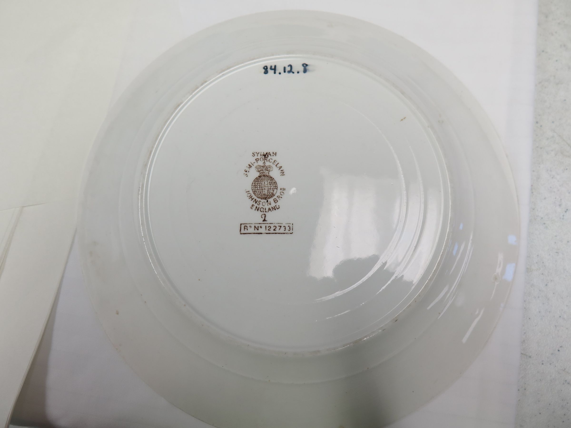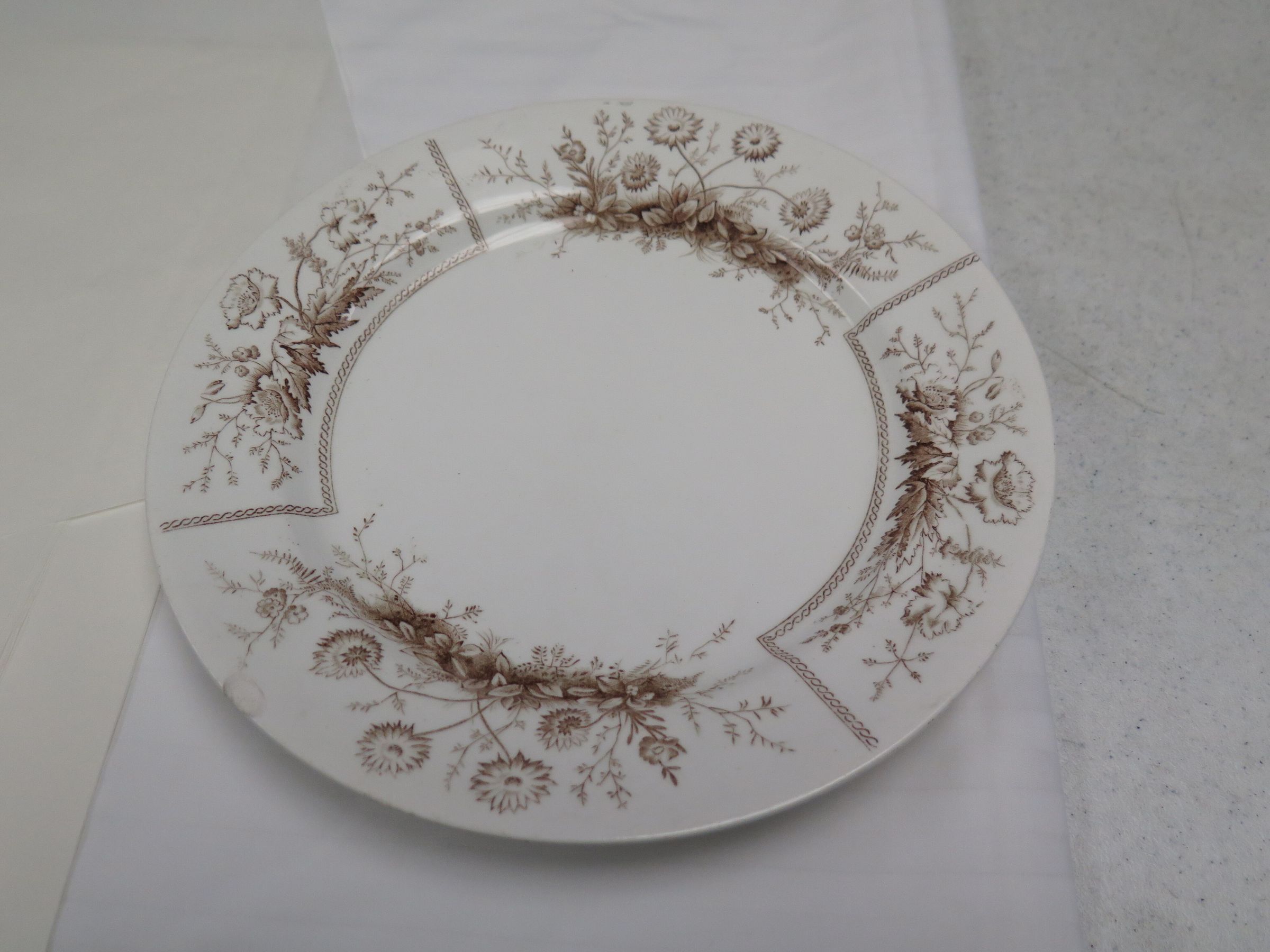 This is a Janson Bros semi-porcelain plate with a brown floarl pattern. The plate measures 1" (h) x 9" (dia).