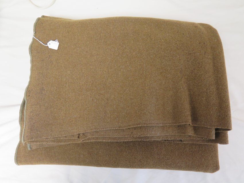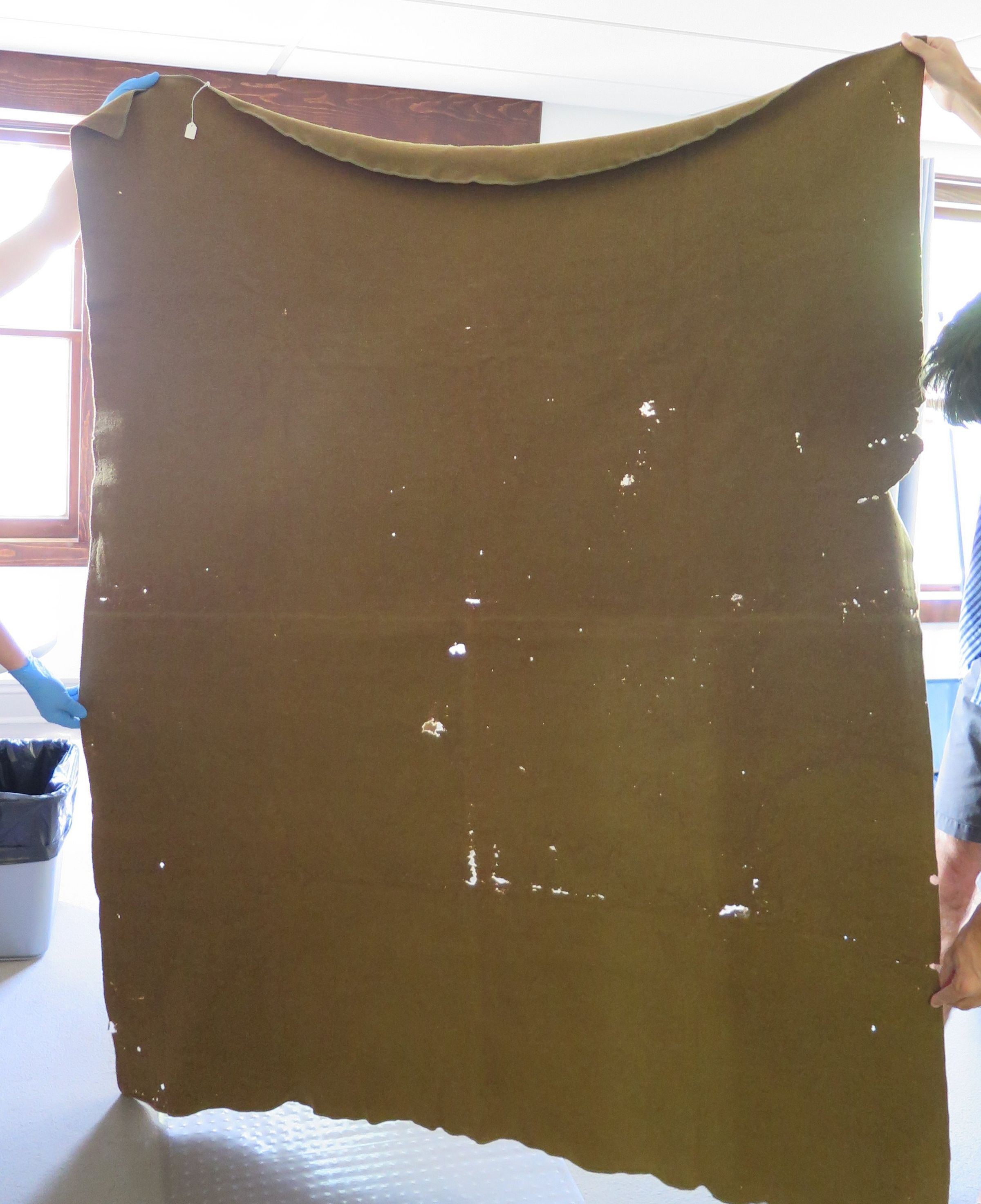This is an olive green wool Army blanket. There is damage to the blanket. More than 10 holes can be seen in the photograph. These vary in size from tiny to several inches in diameter.