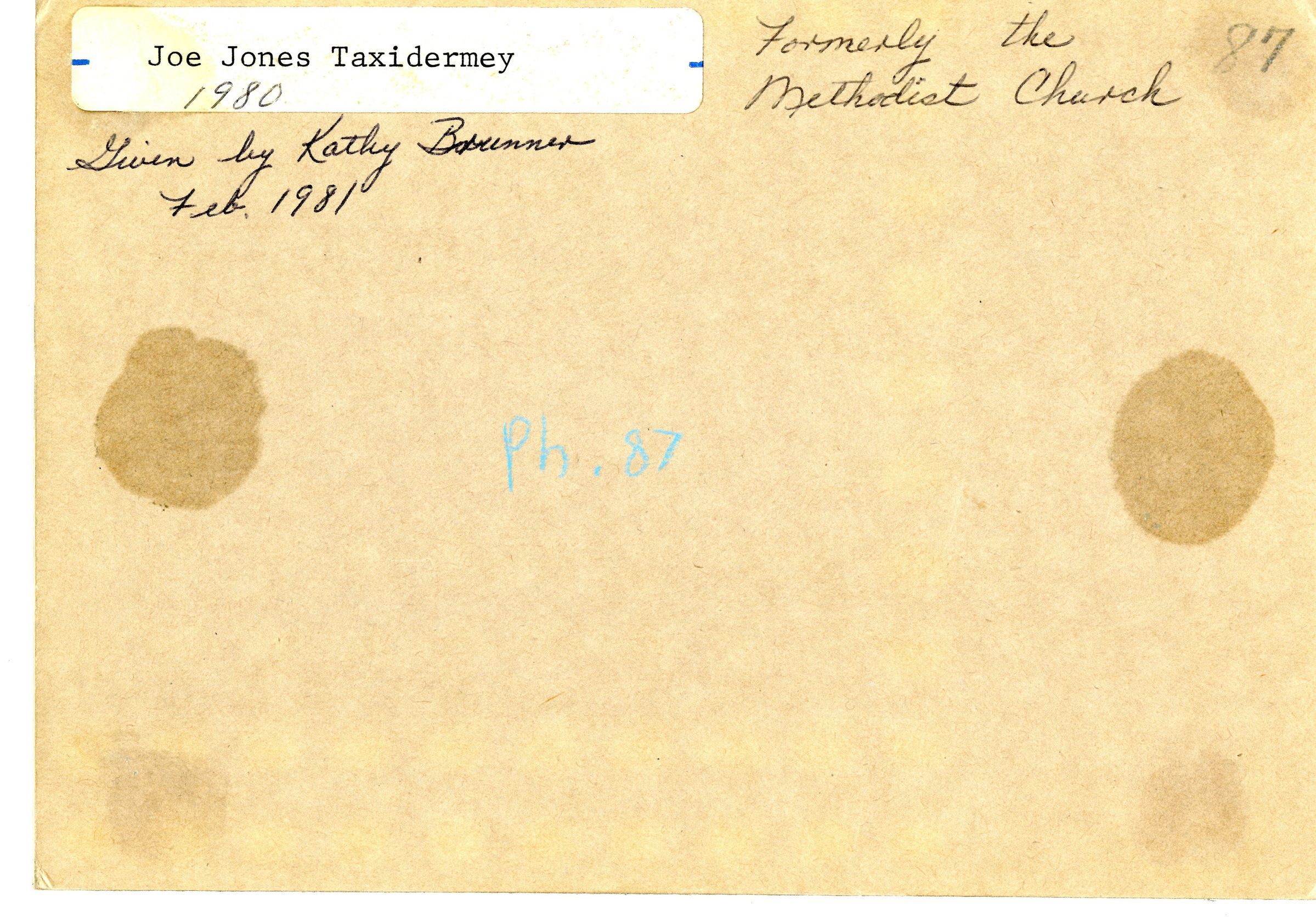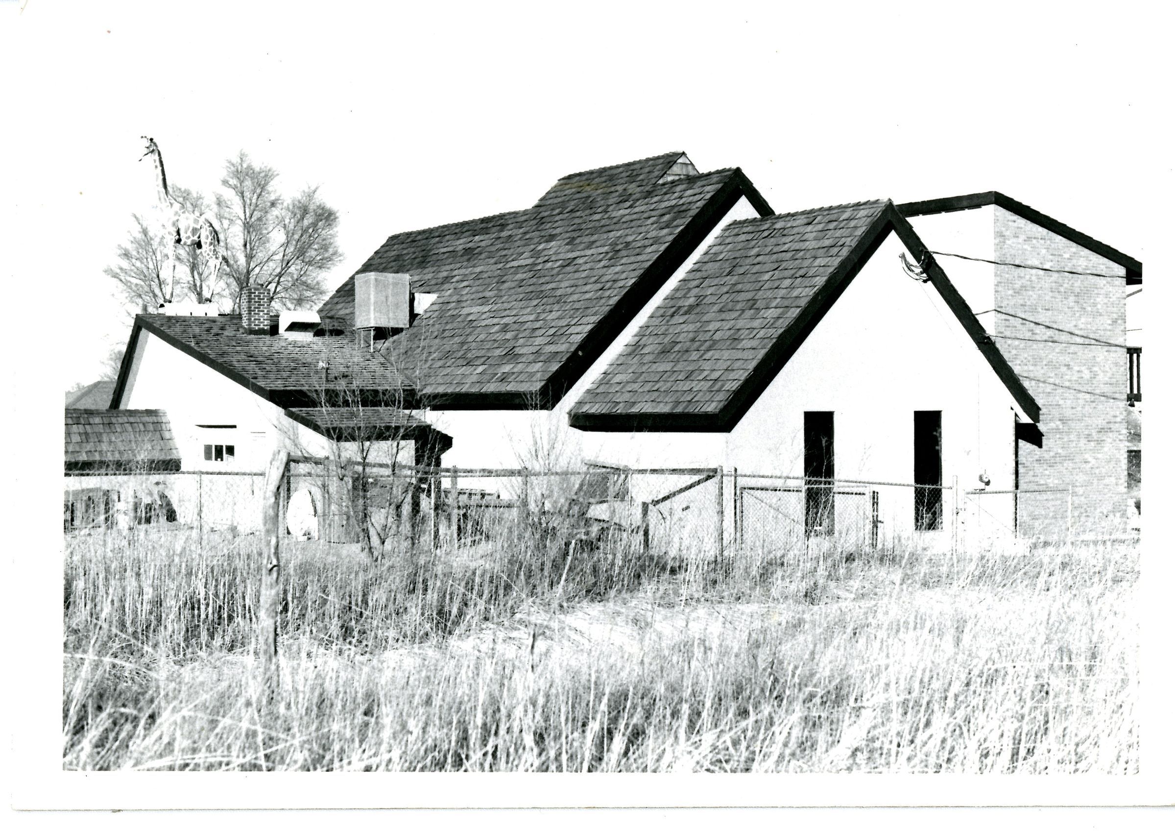 A picture of the Joe Jonas Taxidermy Building that used to formerly be the Methodist Church building. Building is white with dark shingled roof, sitting behind a wire fence. A giraffe sits on top of the roof on the left hand side. The foreground is natural vegetation.