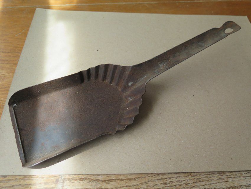 This is a metal coal shovel with a square end and a hole at the end of the handle for hanging. The coal shovel measures 3" (h) x 4.75" (w) x 14.25" (l).