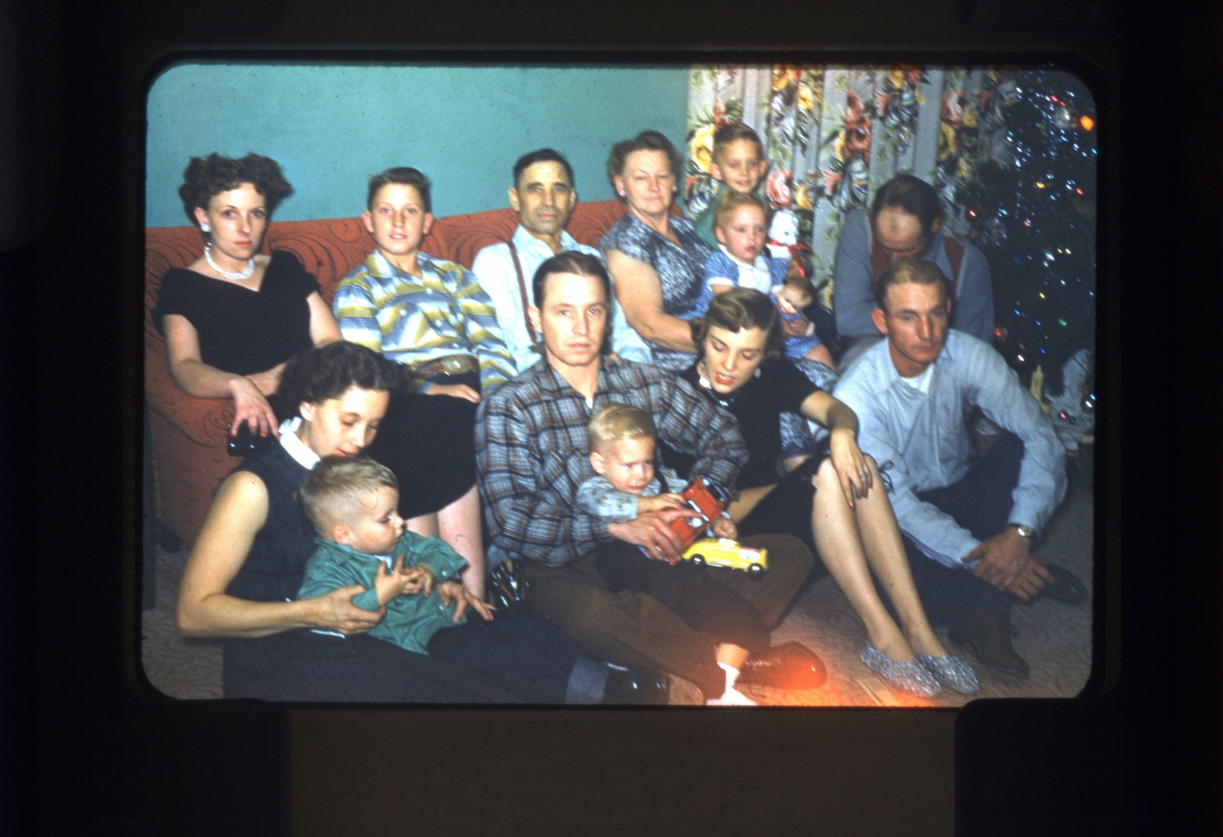 This is a color film of the Brunner Family on Christmas sitting on a red couch by the Christmas tree. Possibly at the Brunner Farmhouse.
