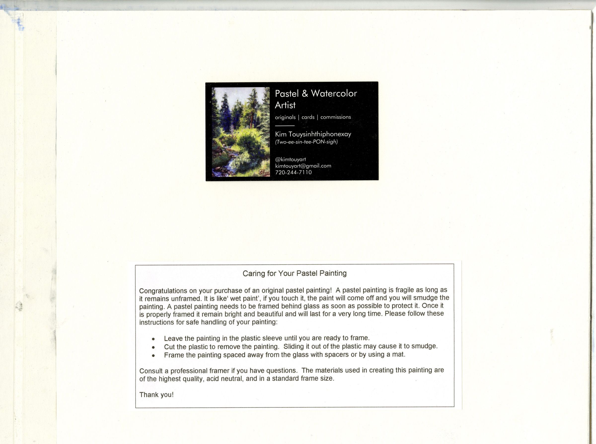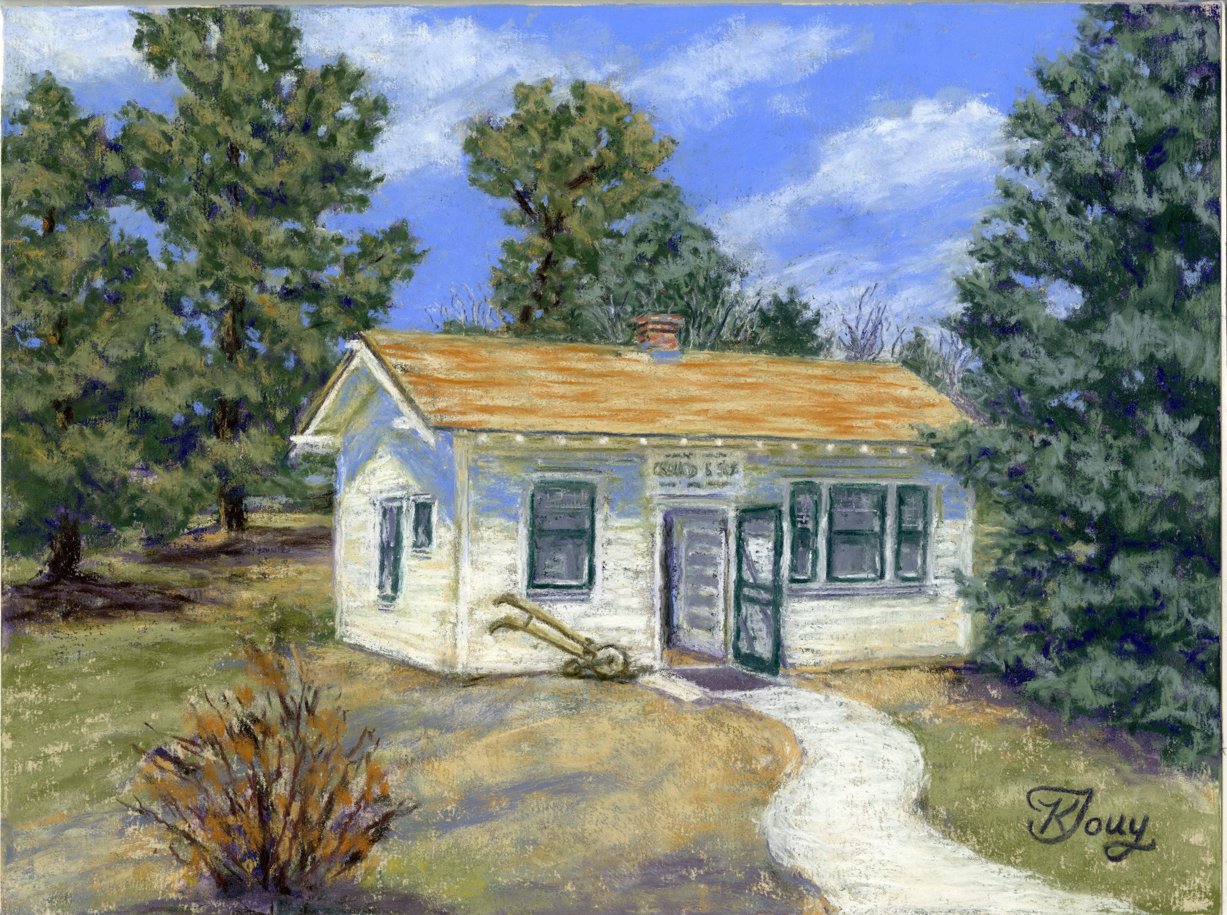 An oil pastel painting of the Honey House made by Kim Touysinththiphonexay. This was commissioned as a part of the Pulse Arts & History event held on April 18, 2023 at the Depot Museum. It depicts the Honey House sitting in a grassy field, surrounded by trees. There's a bush and path up to the Honey House in the foreground. The Honey House is depicted with an open front door and a seeder laying against the front wall near the entrance. Sky is bright blue with white clouds. Created on thick 9"x12" paper.Artwork Details