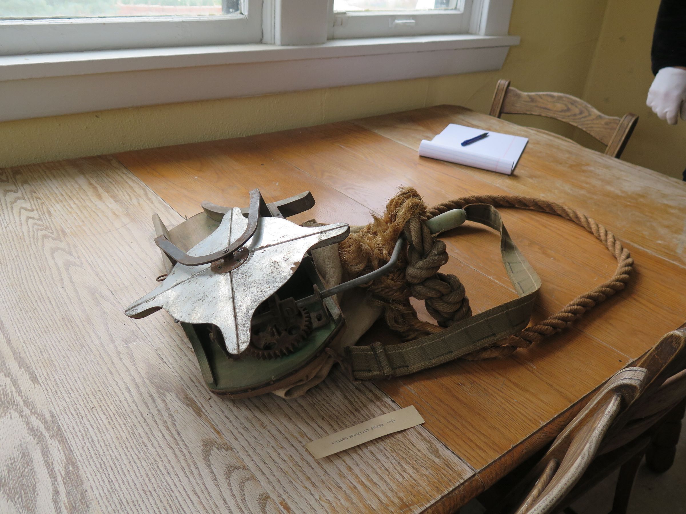 Metal cyclone broadcaster seeder with a wooden base and canvas bag, with a sling and a rope tied around the sling from 1934. This is a Cyclone brand hand cranked farm seeder called the Seed Sower. The Cyclone Seeder Co. Inc. existed in Urbana, Illinois starting in 1868. This farm seeder is made for broadcast seeding, a technique used mostly for grains and forage crops. The seeder measures 11" (h) x 15.5" (w) x 16" (l).Collection