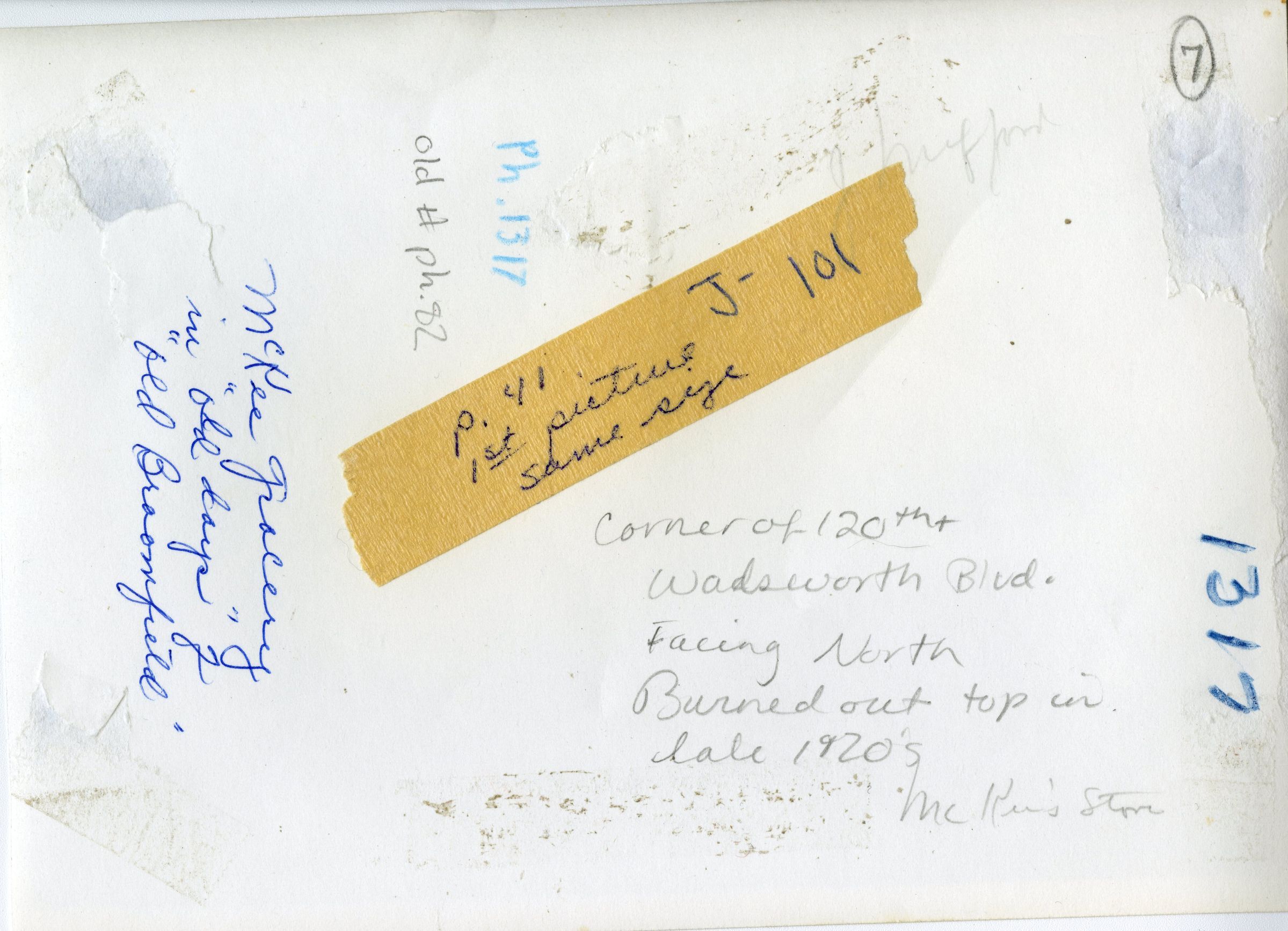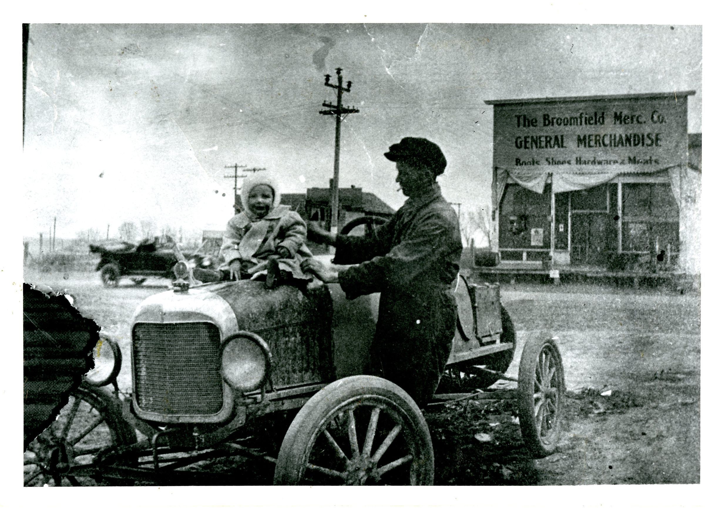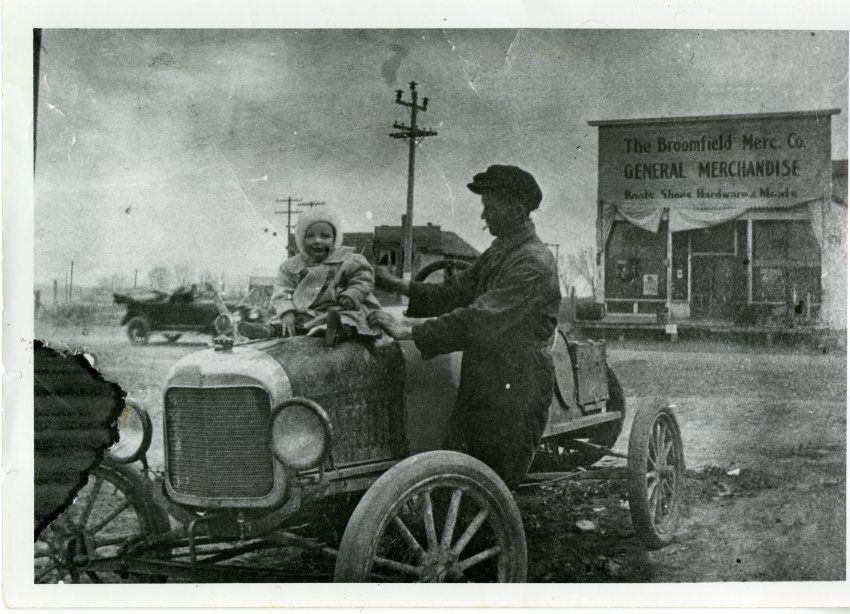 McKee Grocery in Old Days of Old Broomfield. Corner of 120th and Wadsworth Blvd. Facing North. Burned out top in late 1920's.Sign at top of the store states;