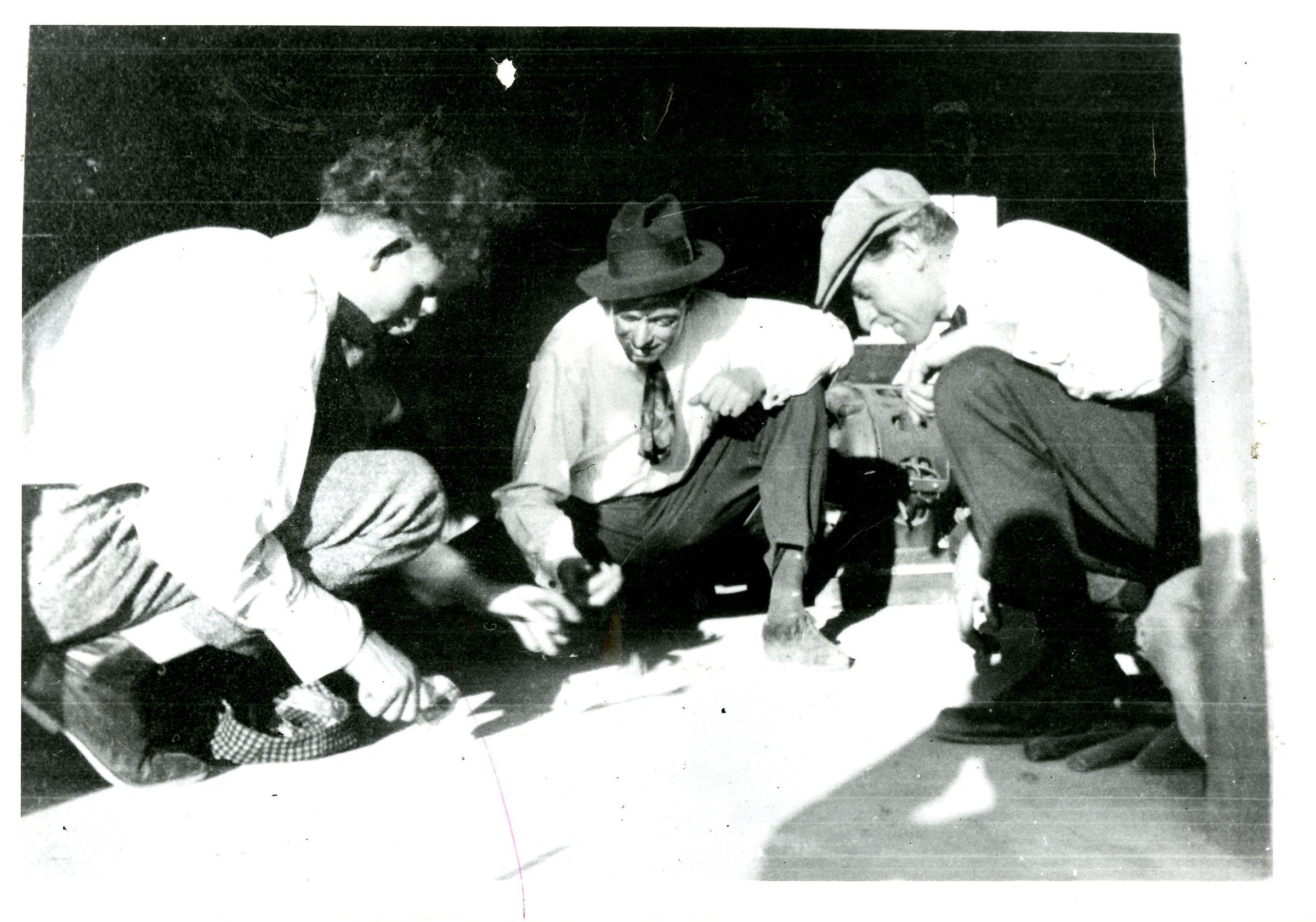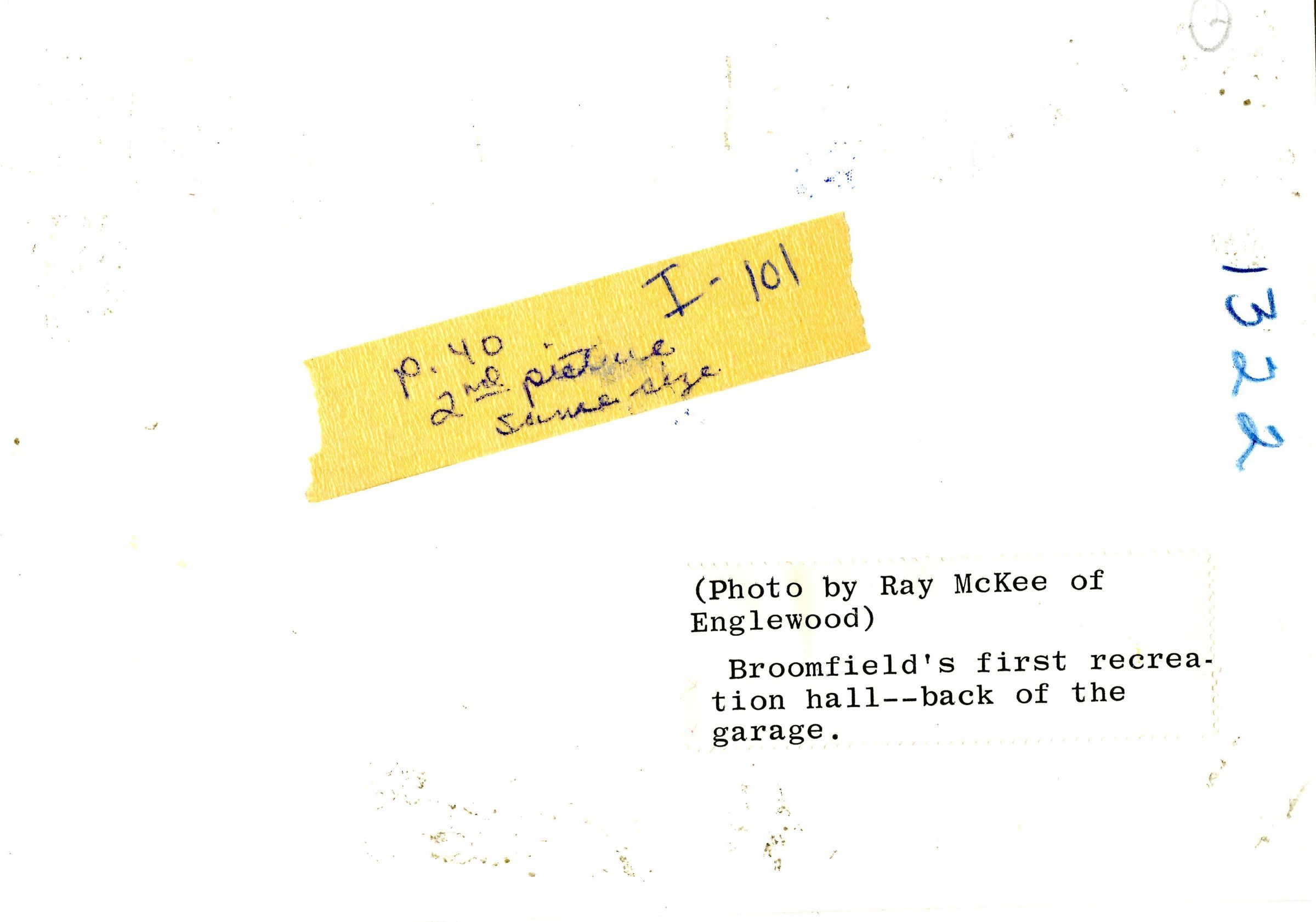 Broomfield's first recreation hall-back of the garage.Three men are low to the floor in a semi-circle possibly playing a game or discussing some plans..