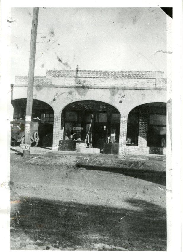 Old Broomfield Garage (burned). is same as State Patrol Building. Building showe three openings - one has a car parked in front of it.