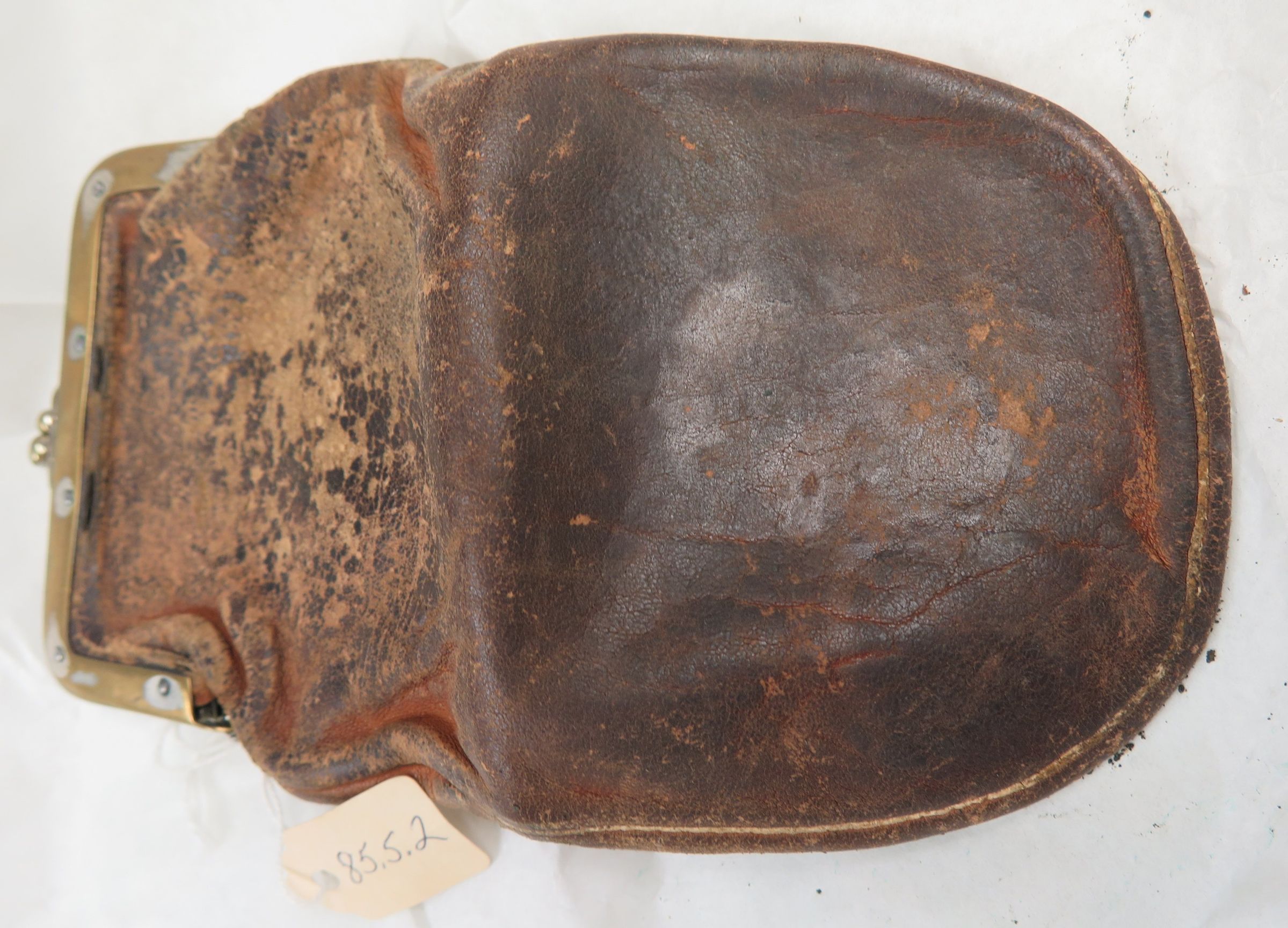 This leather coin purse measures 7"(L) x 4"(W). It features a brass closure. The leather is quite worn around the closure area. This purse contains pennies and one silver dollar.
