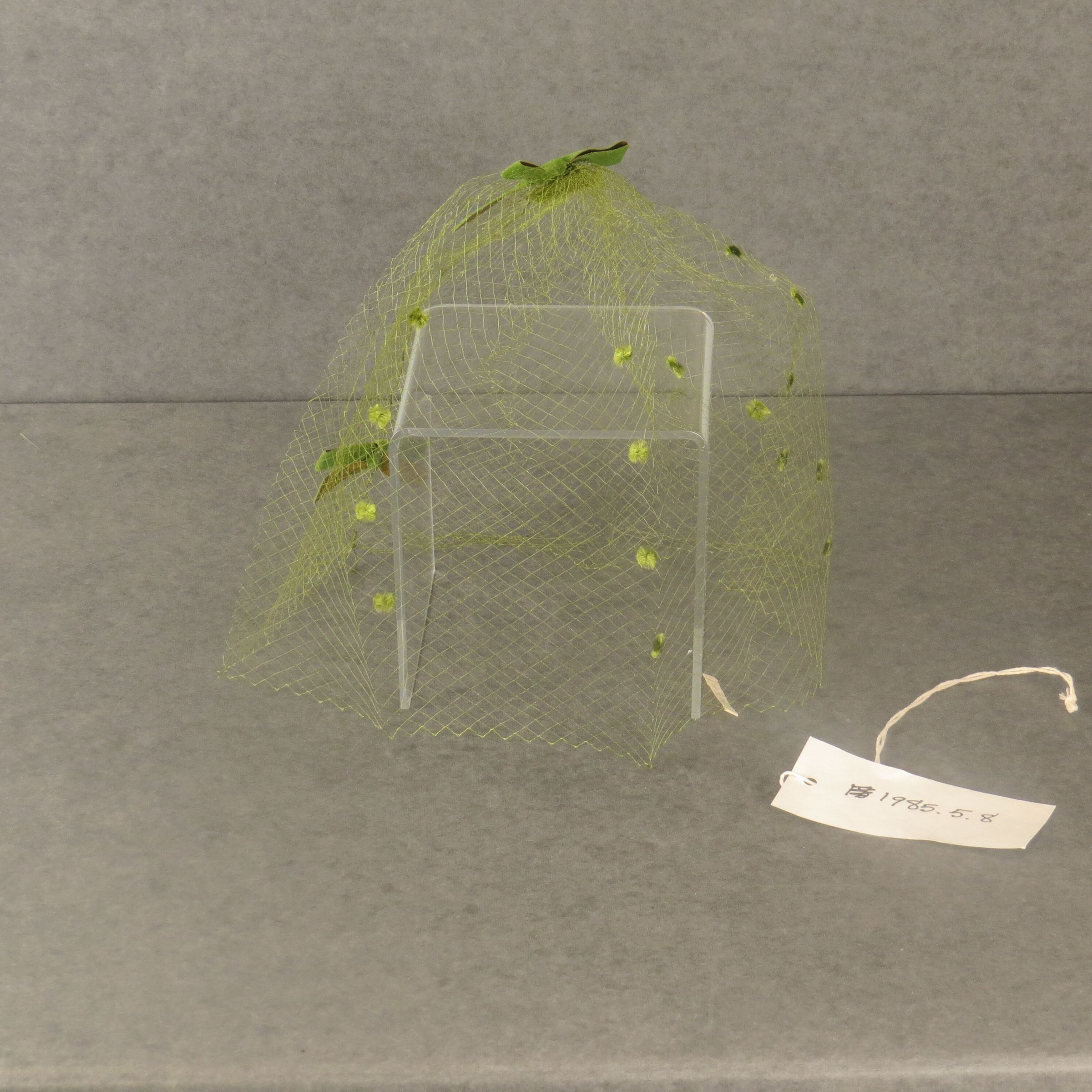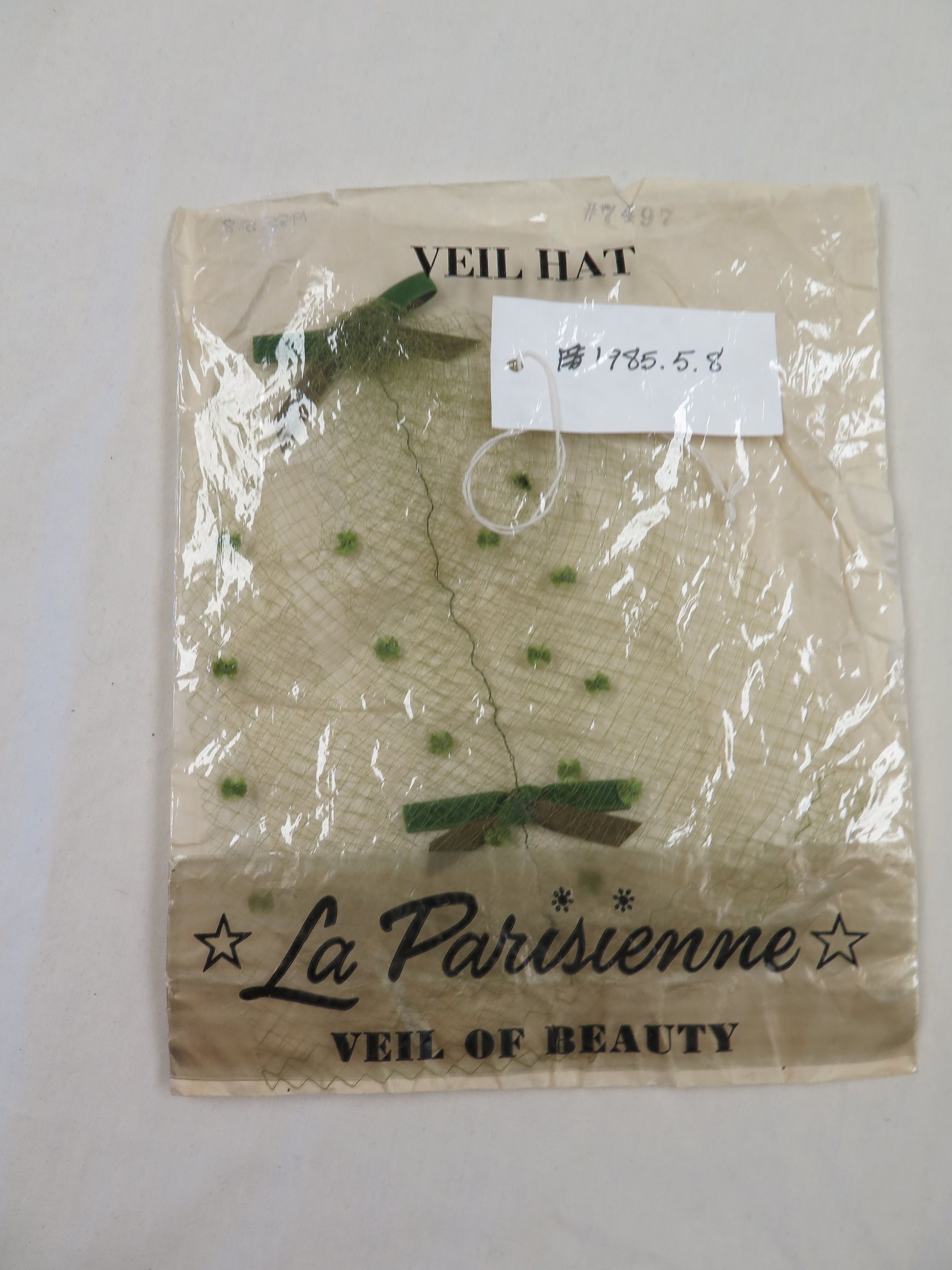 Veil hat with green netting, chenille spots and velvet bows in package with green netting and chenille spots and velvet bows. Package reads "Veil Hat/ La Parisienne/ Veil of Beauty." Hat measures 8" (w) x 10" (l).These are often known as Whimsies.