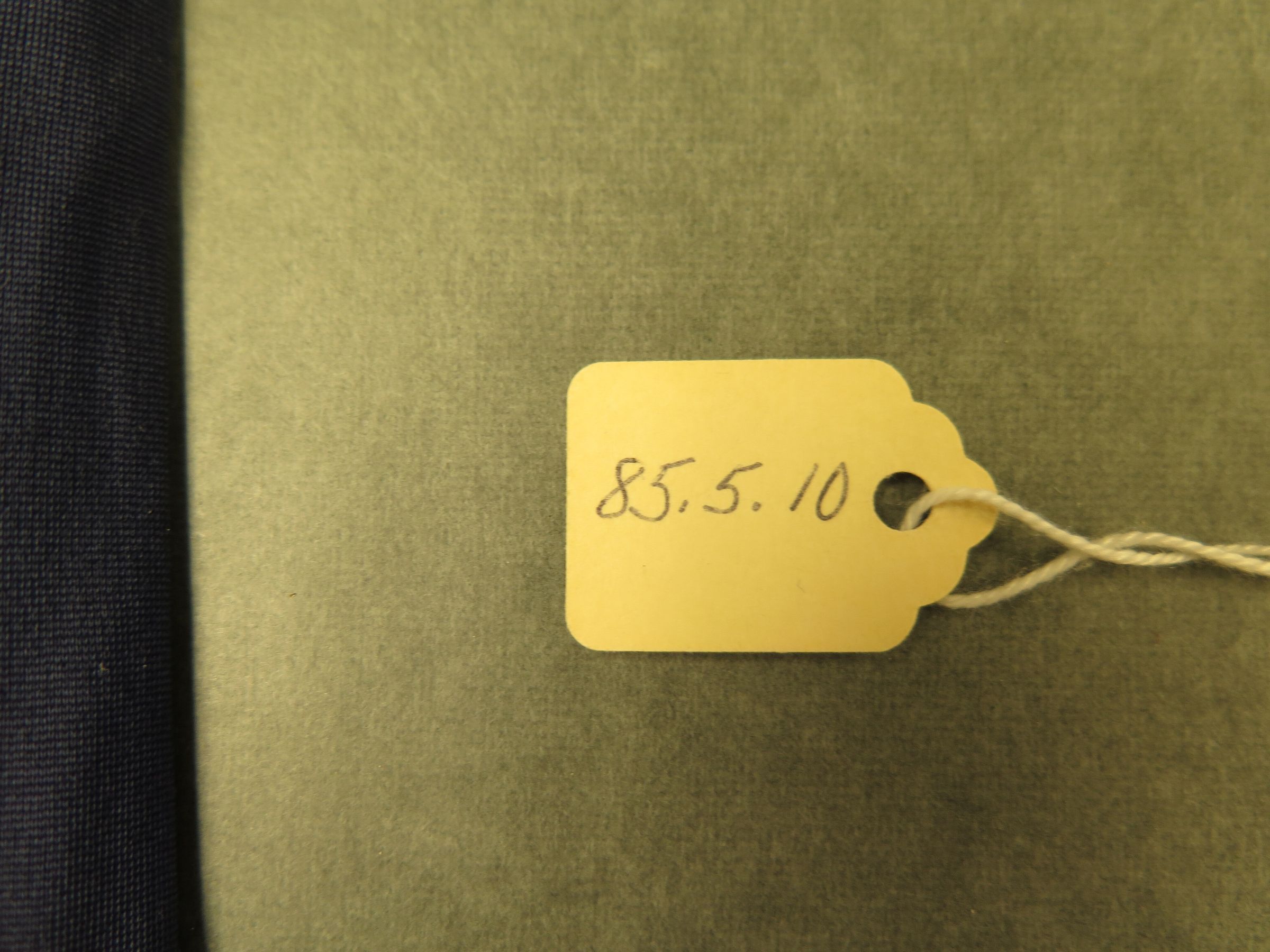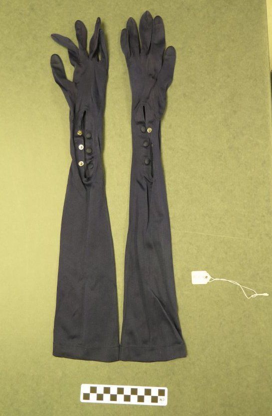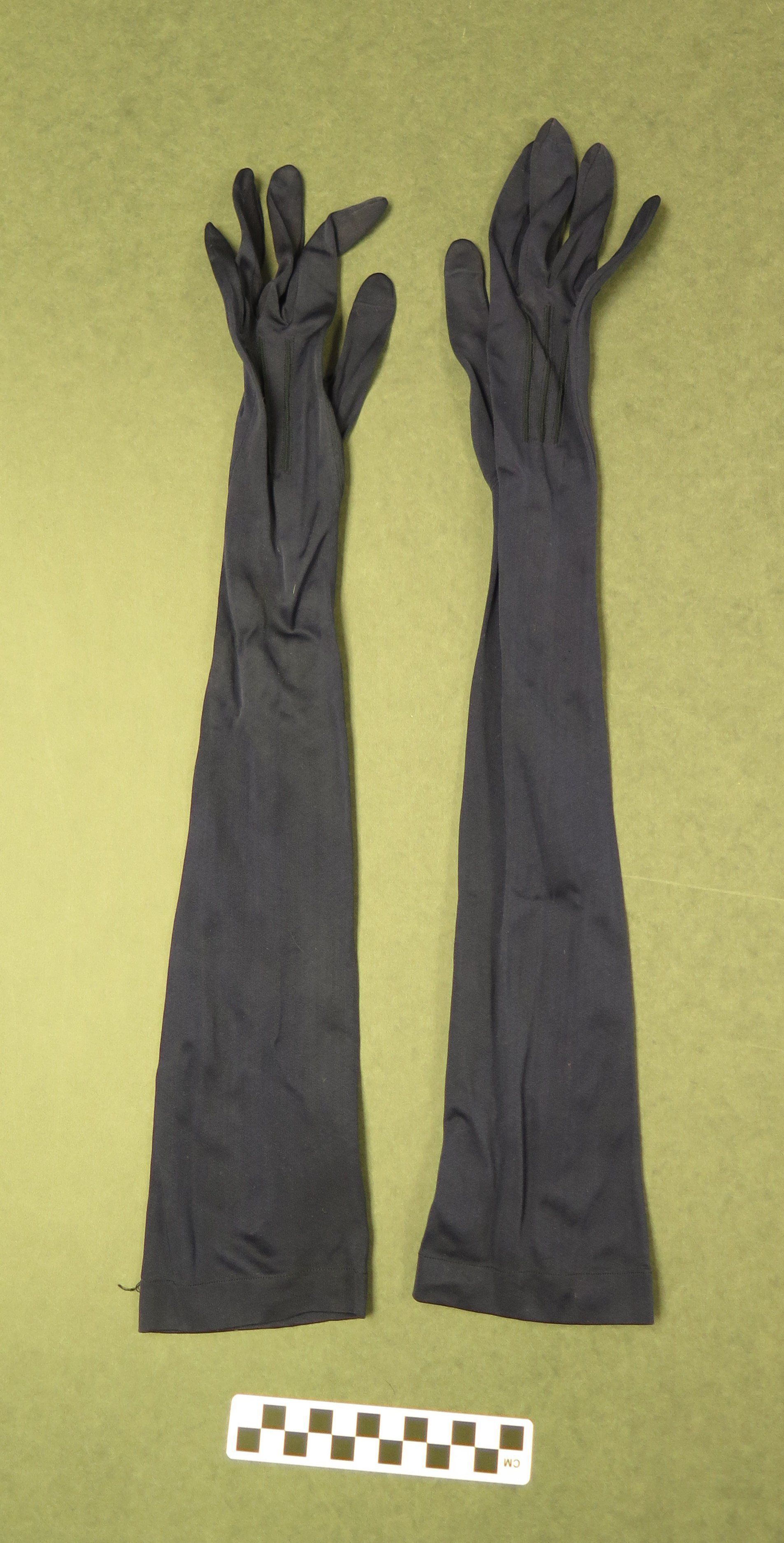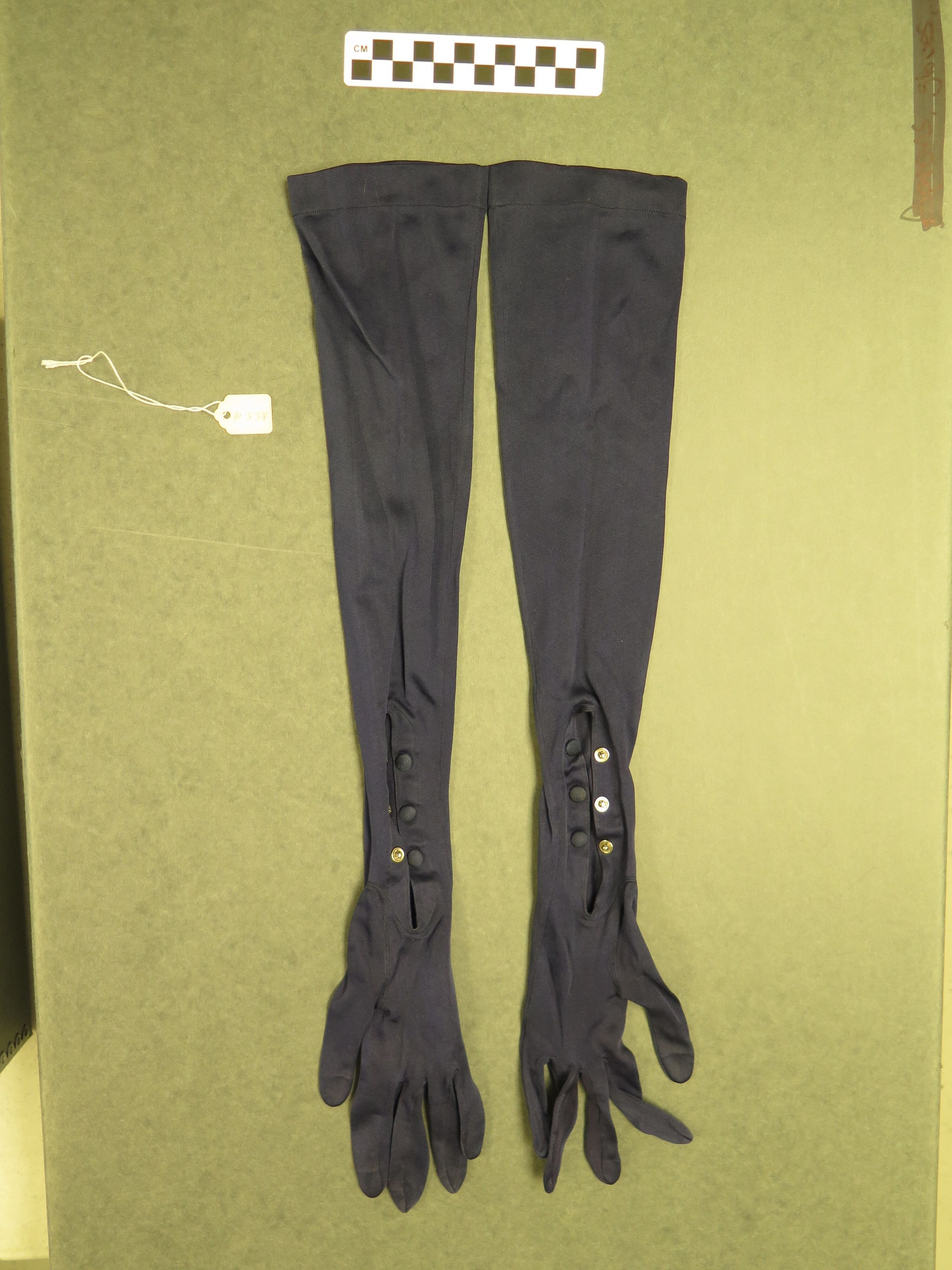 This is a pair of navy blue satin elbow length gloves. A tag on the inside read, "Niagara Maid TM. TWO 07". Each glove has 3 snap buttons on the inside of the wrist. Each glove measures 2" (w) x 21" (l).