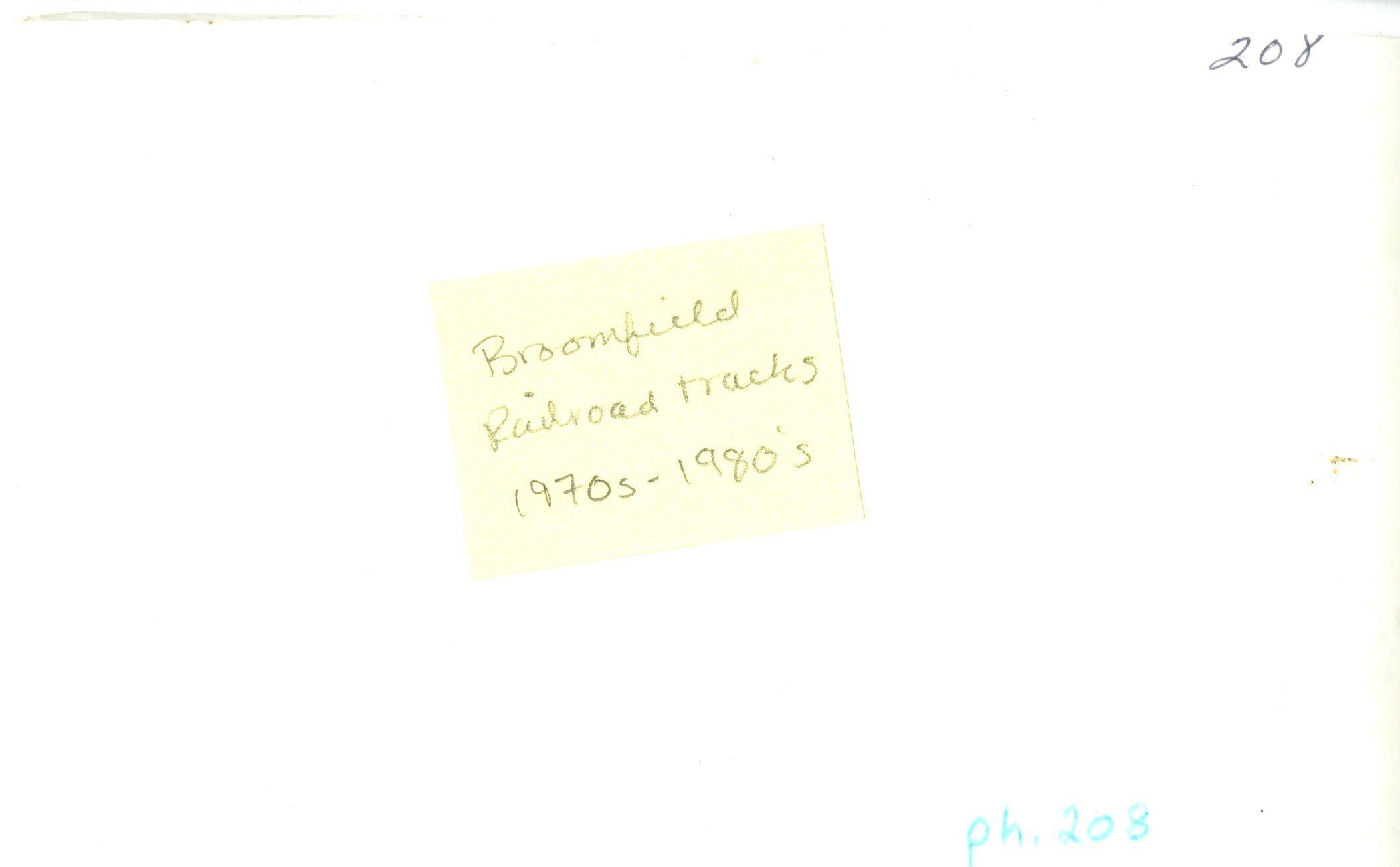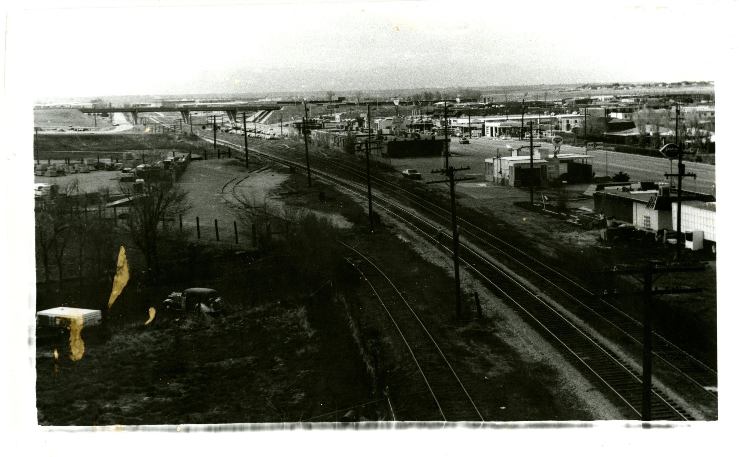 Broomfield Railroad tracks. 1970's 1980's. Rail yards in old Broomfield looking West from atop Coors Elevator. Highway 287 to the right of the tracks. Pre 1975.