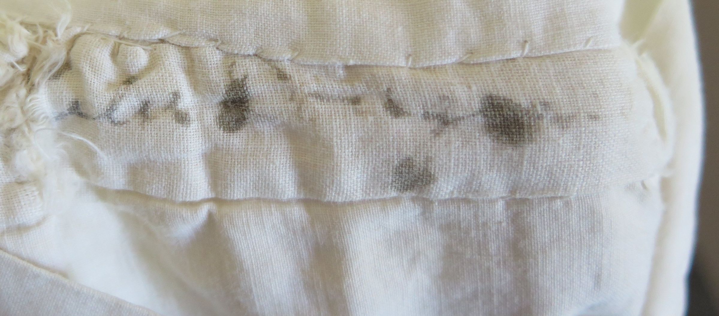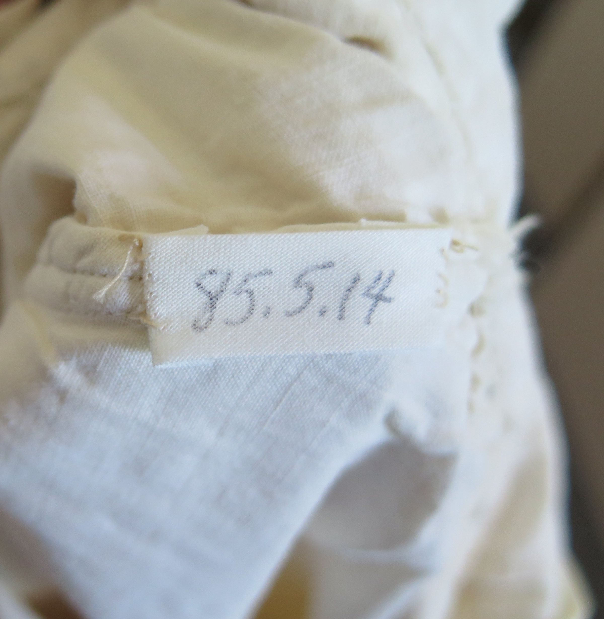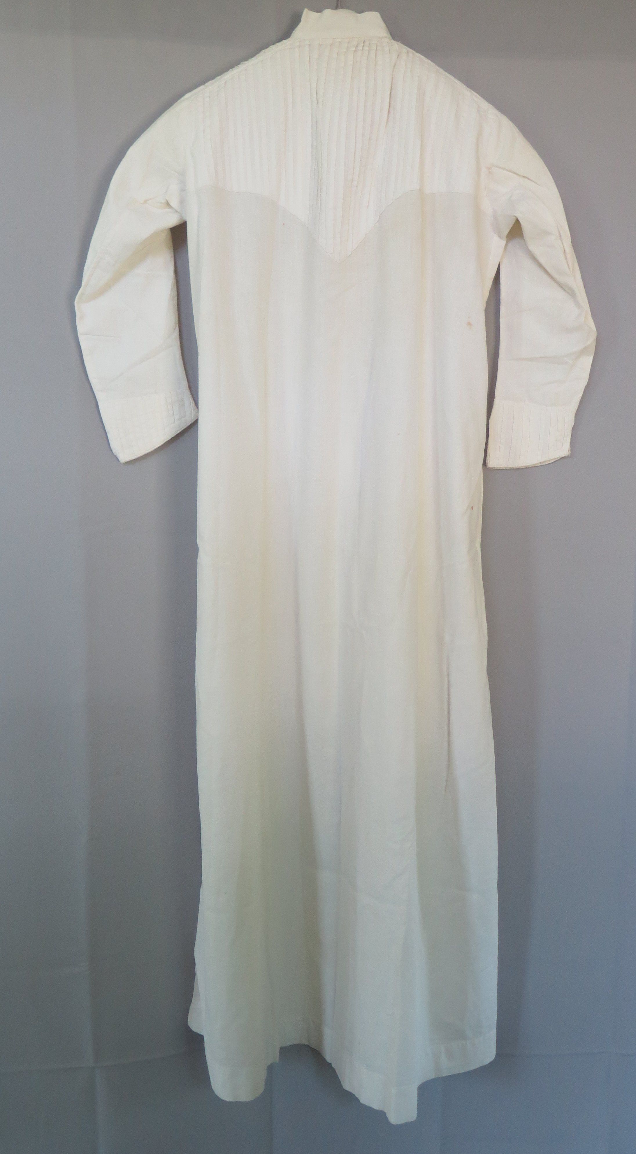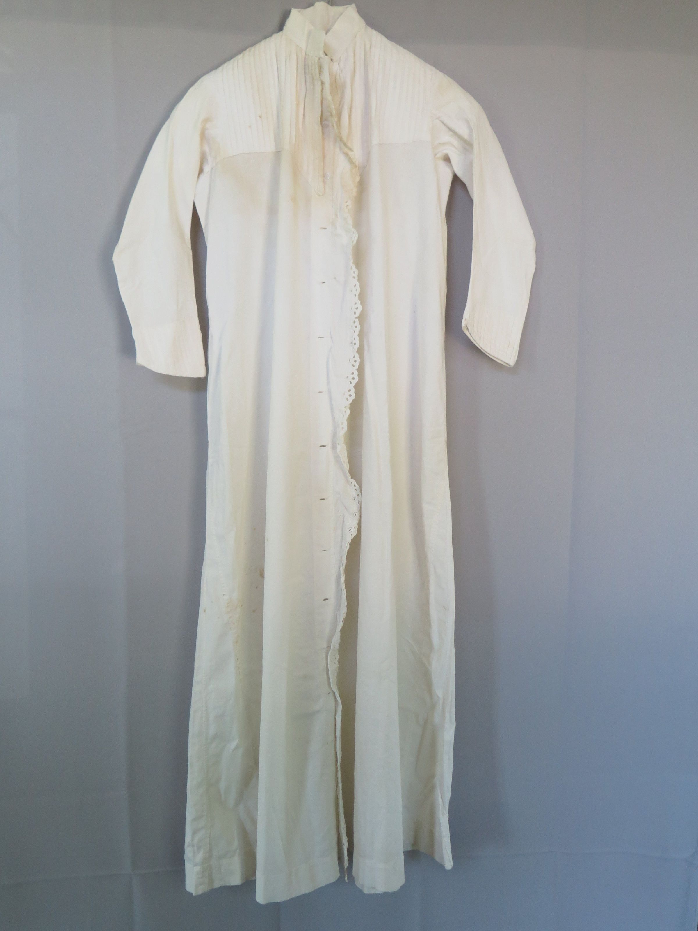 Women's white night gown, circa 1914 (Lulu Collins). The nightgown is a button up with long sleeves and a mandarin collar. There is scalloped crochet on the front of the night gown trimming the holes for the buttons. There is a layered striped design on the top of the nightgown in both the front and the back. This nightgown was most likely hand made and has something written on the inside back collar which is most likely a name. The nightgown measures 20" (w) x 47" (l).