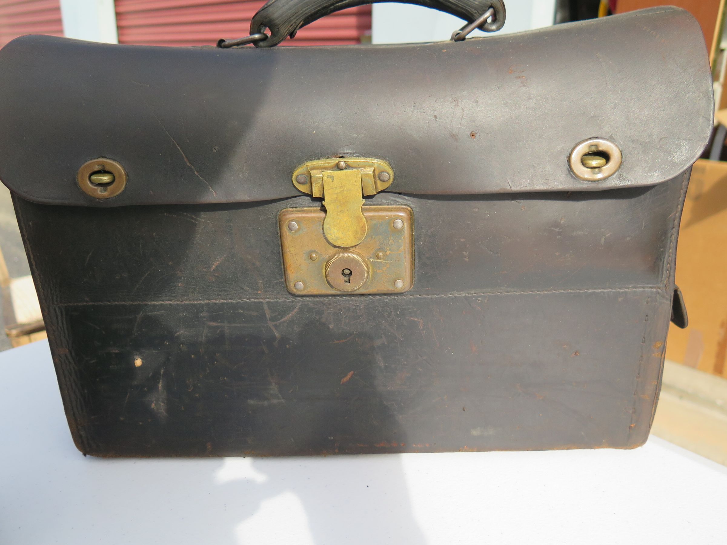 This is a leather toolbox with a handle on top and a metal clasp on the front. The toolbox measures 11.5" (h) x 15" (w) x 5" (d).