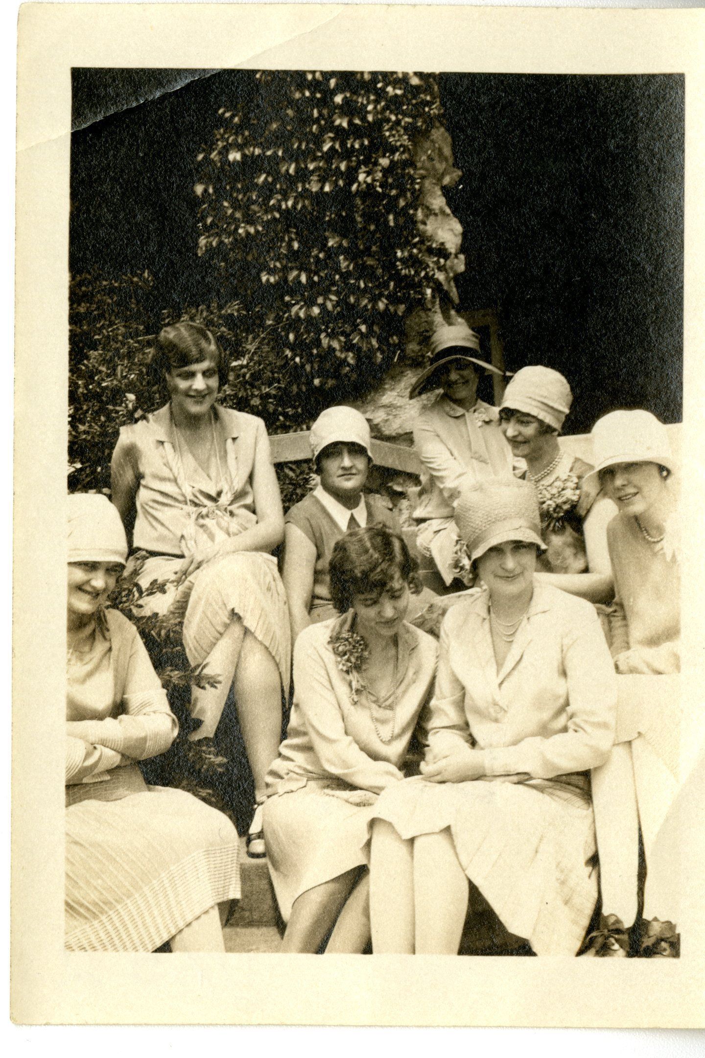 8 women sitting on stairs. 6 with hats, 2 without.