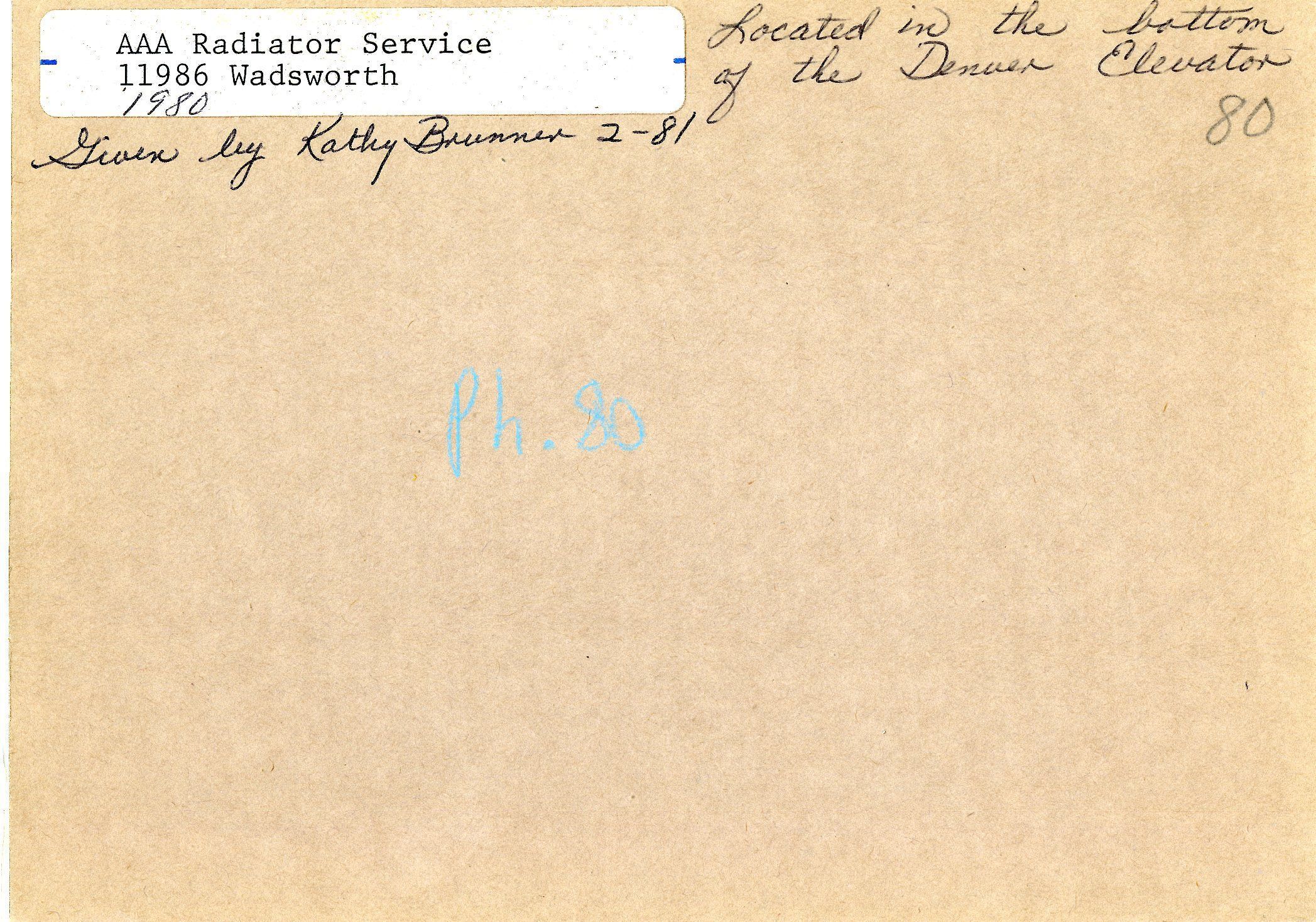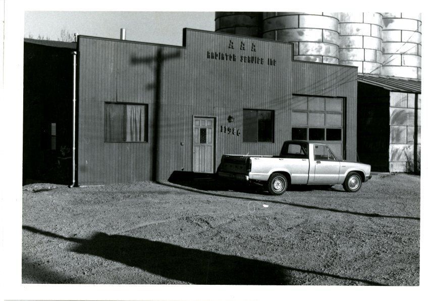 Black and white photo of AAA Radiator Service building located at 11986 Wadsworth. Photo shows building with siding, two windows, a door, and one garage bay, with the Denver Elevator in the background. Also shows a small pickup truck in front of the building. Photo taken in 1980.Collection