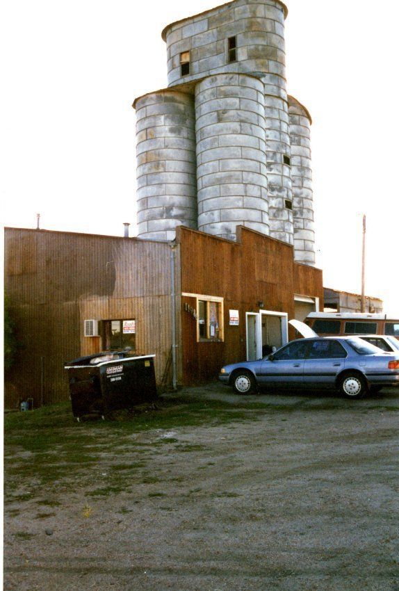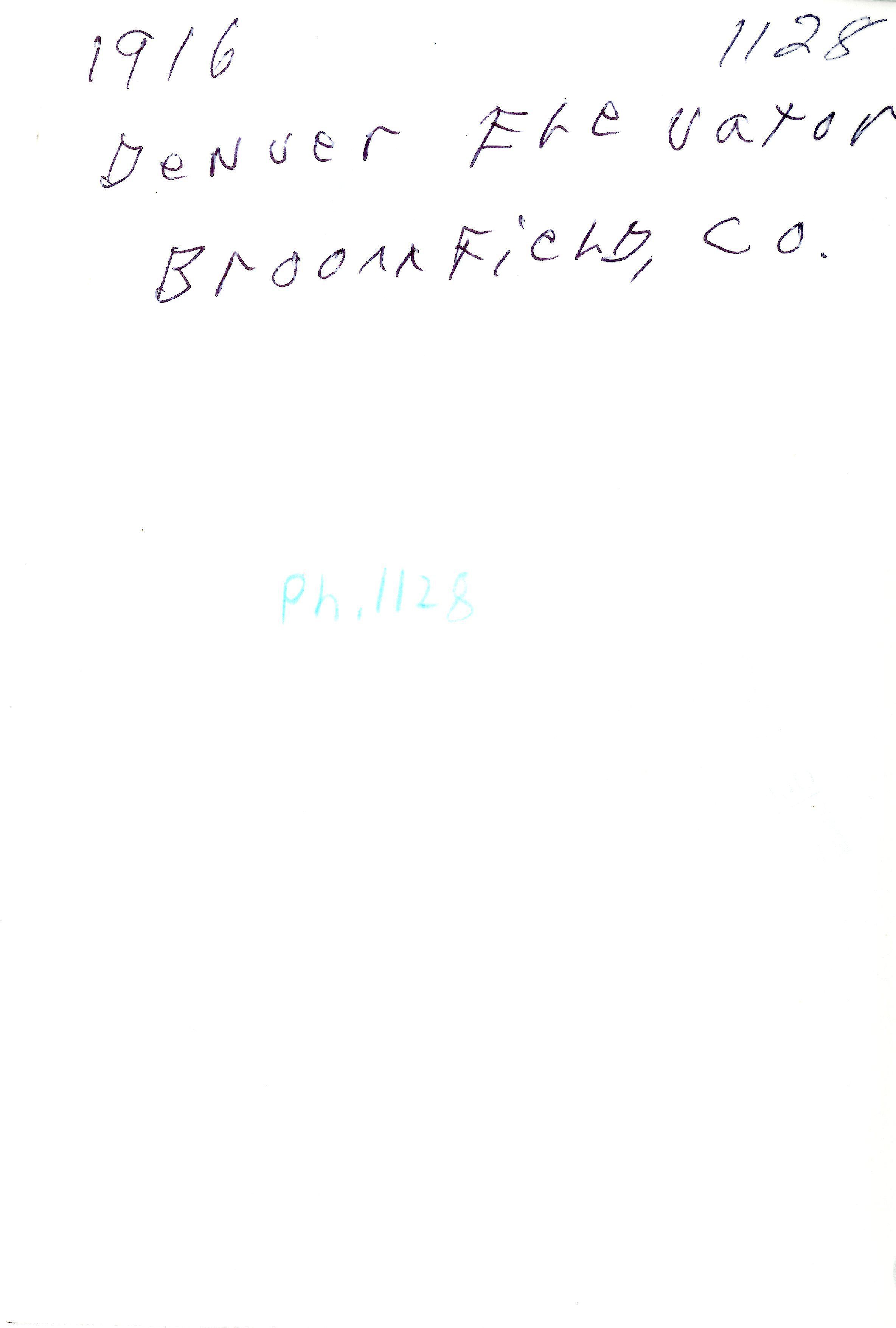 Color photo showing the Denver Elevator built by Adolph Zang between 1913 and 1916 in the background some small wood shop buildings. The buildings have no signs, but there are several cars in front of the building that once was AAA Radiator Service.