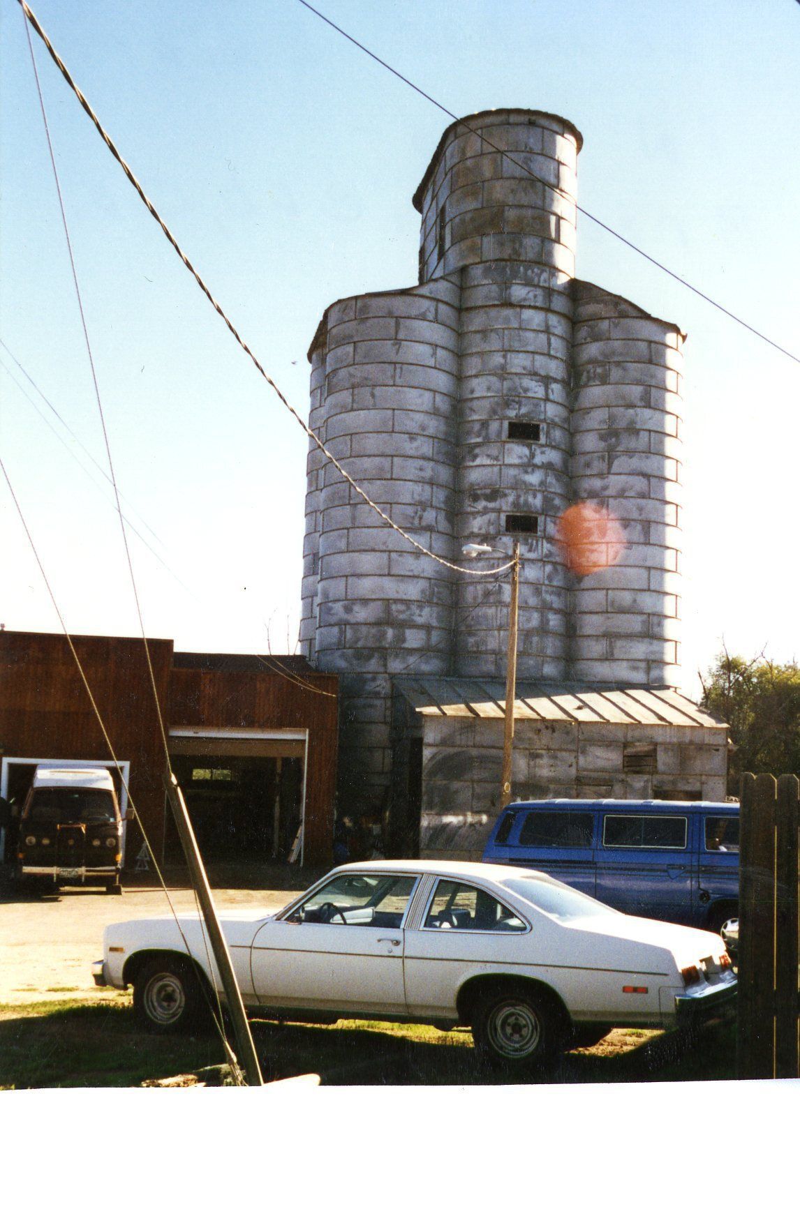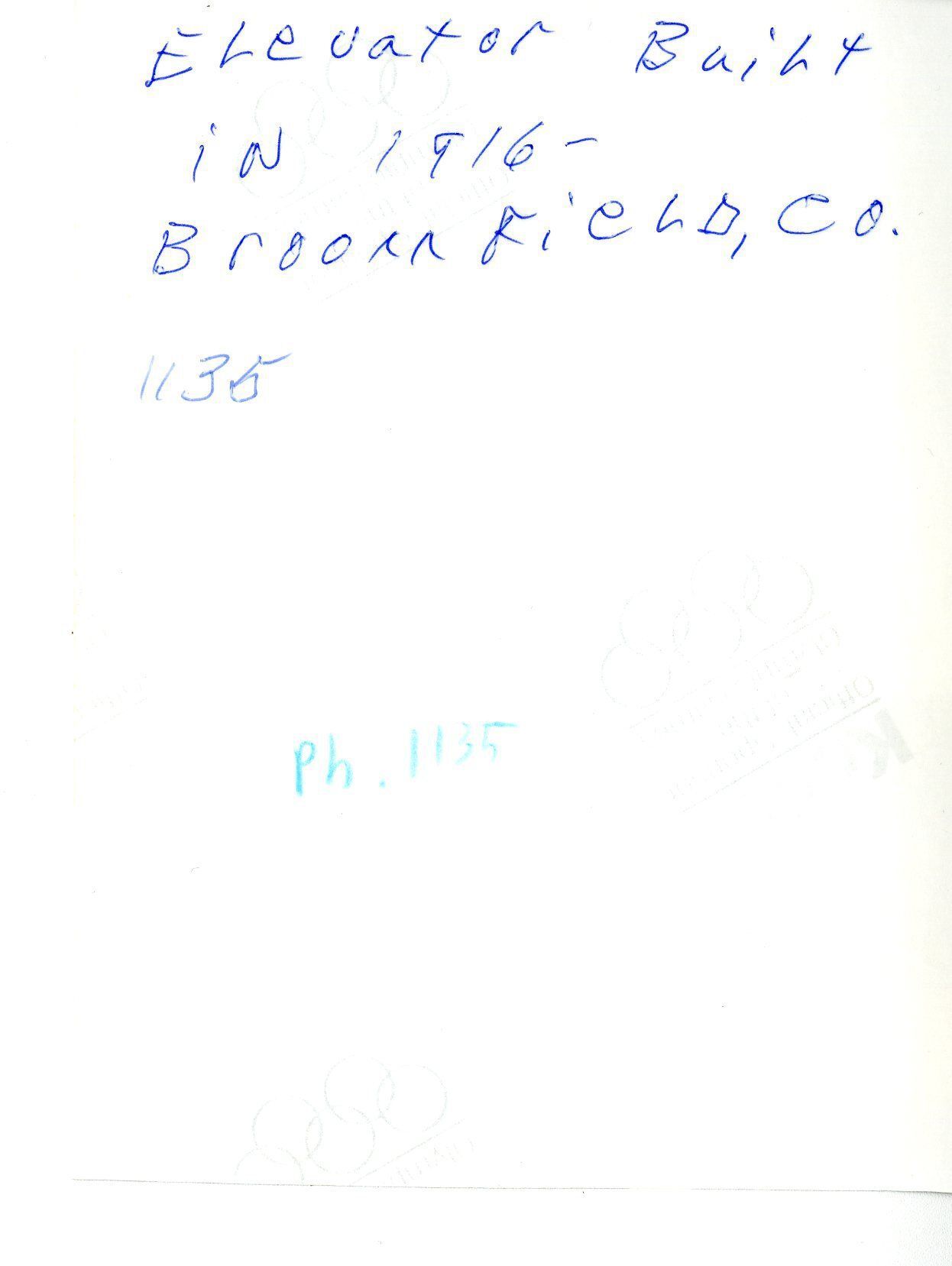 Color photo showing the Denver Elevator built by Adolph Zang between 1913 and 1916 in the background of a brown wood building. There is no signage on the building but it once was AAA Radiator Service and has one garage bay and several vehicles in the parking lot.