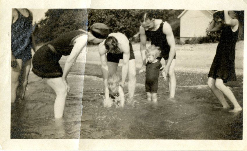 Black and white photo showing three men, two women, and two children in swimsuits, wading in some water.