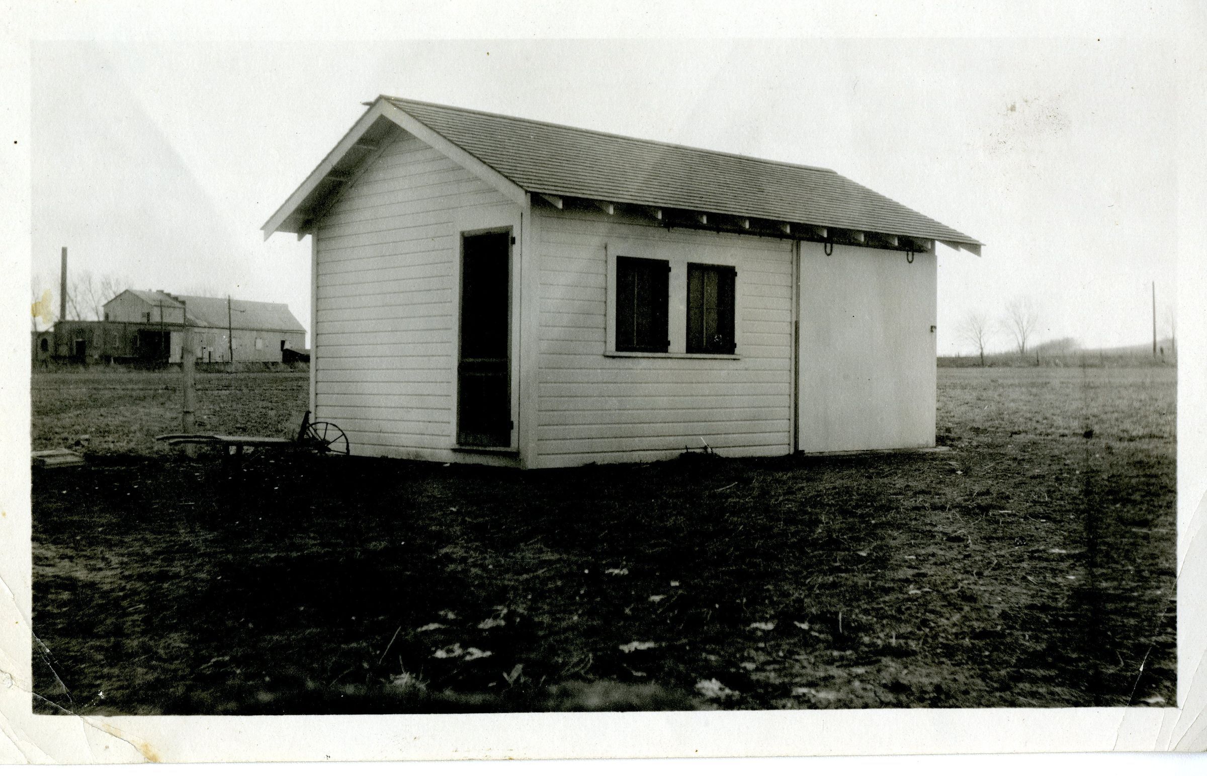 "Honey Extraction house of the Crawford property". B&W photograph. Original. Backside of Honey House at Crawford Farm, original location. 120th visible behind building.