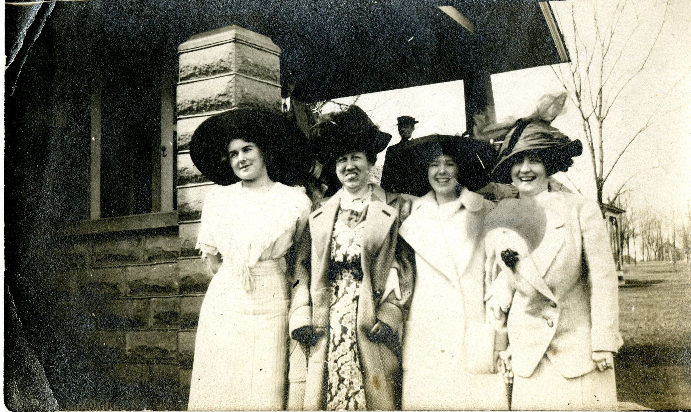 Black and white photo showing 4 women standing in front of a brick building. They are wearing fancy dresses and coats with large brimmed hats. Circa 1900.