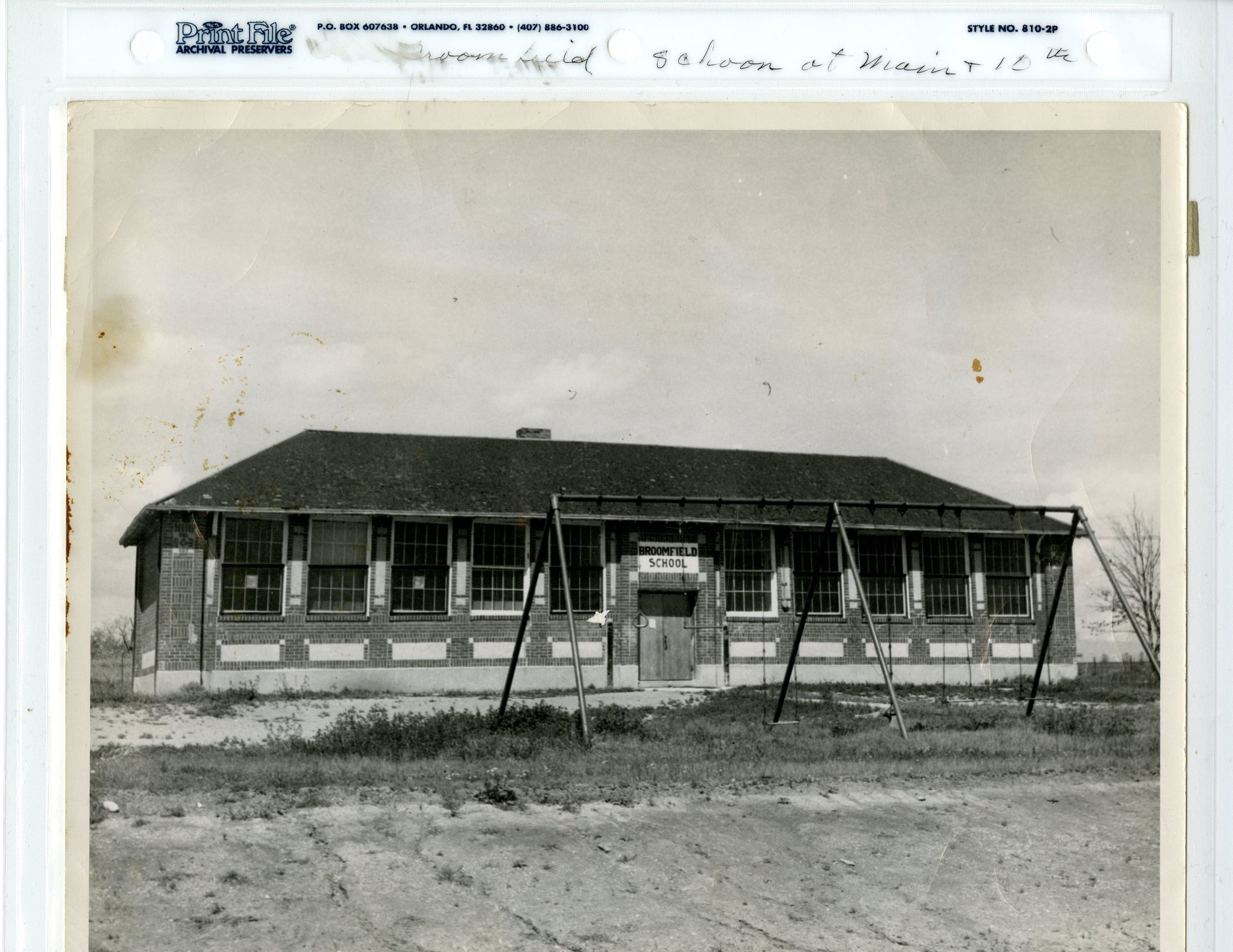 Old Broomfield School, built 1921, used prior to 1955. Southwest Corner of 10th and Main st. faced East. Torn down 1958. Swing Set out front.Collection