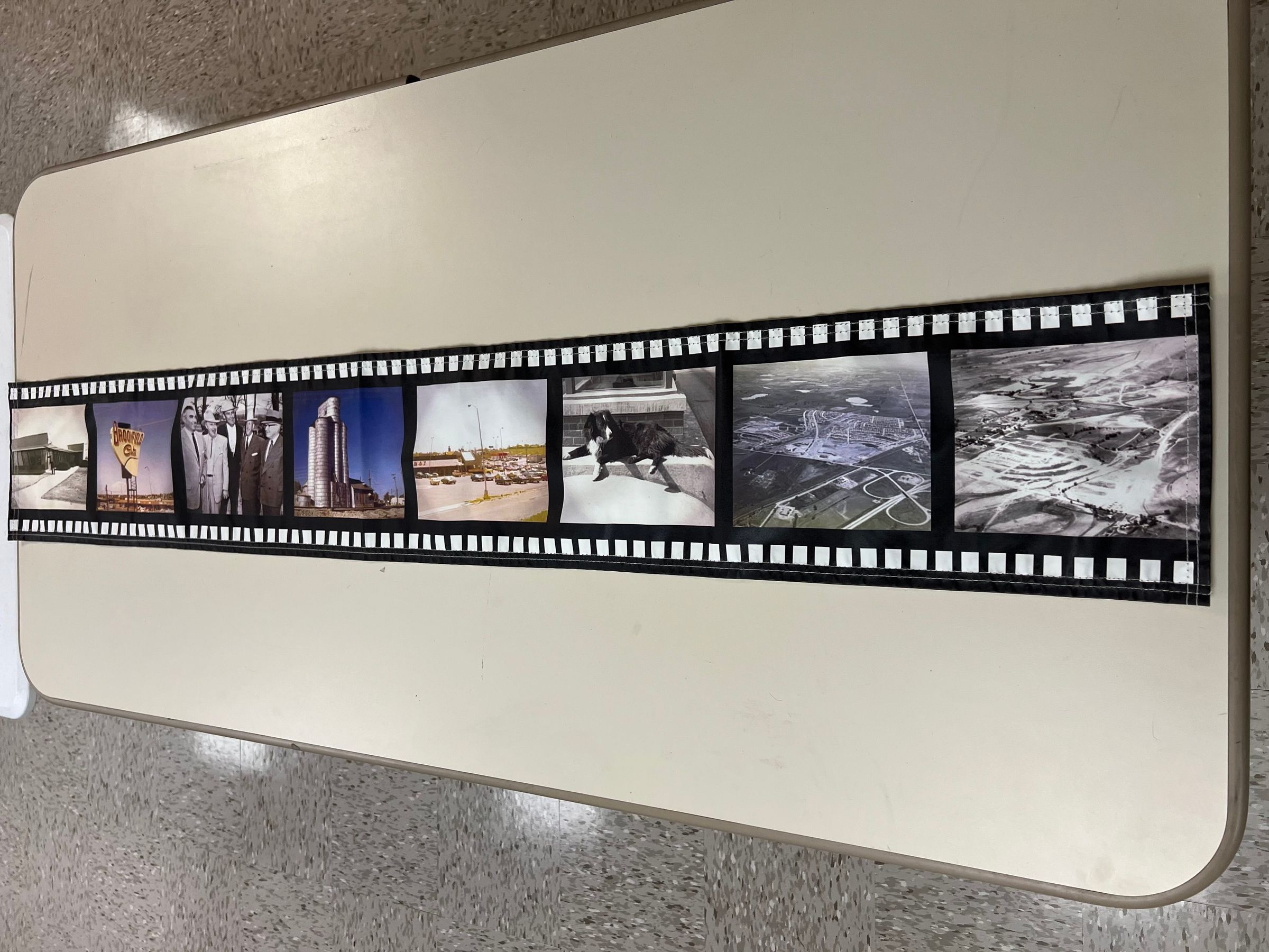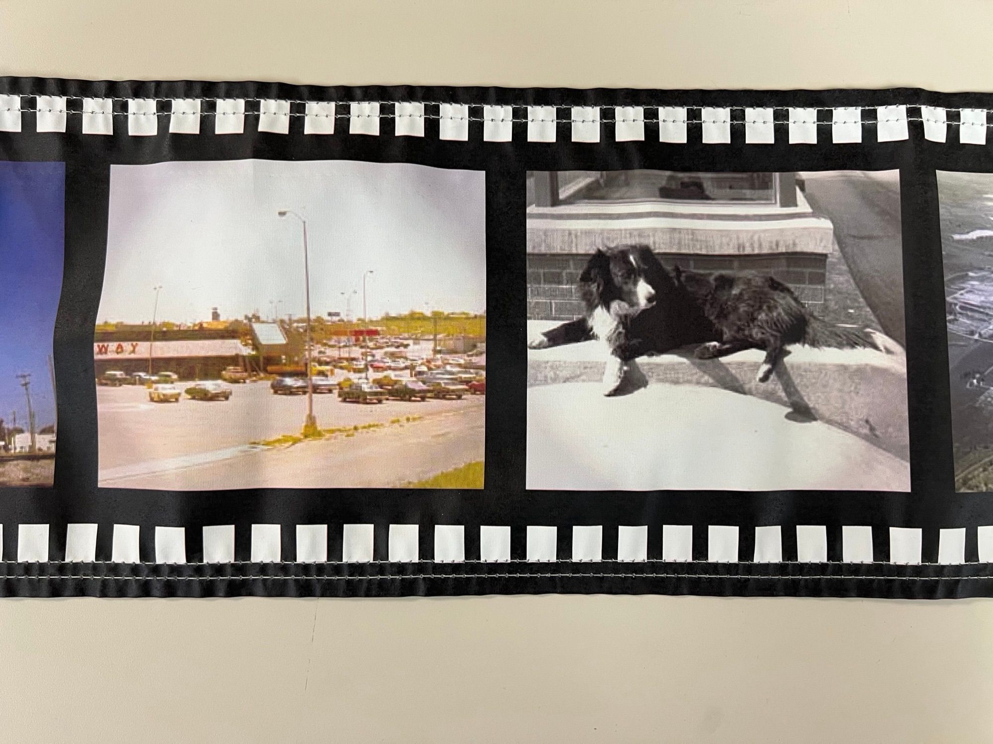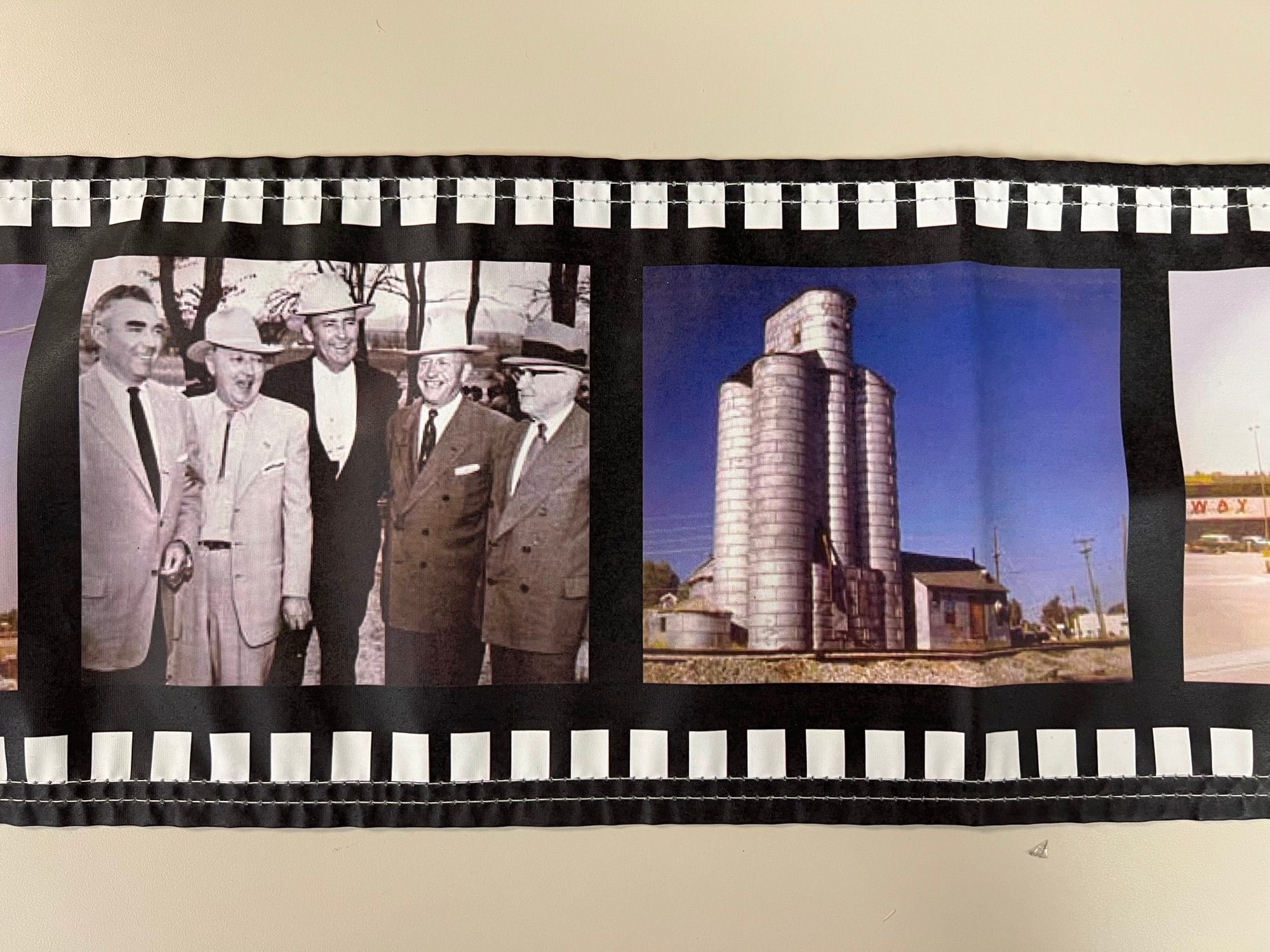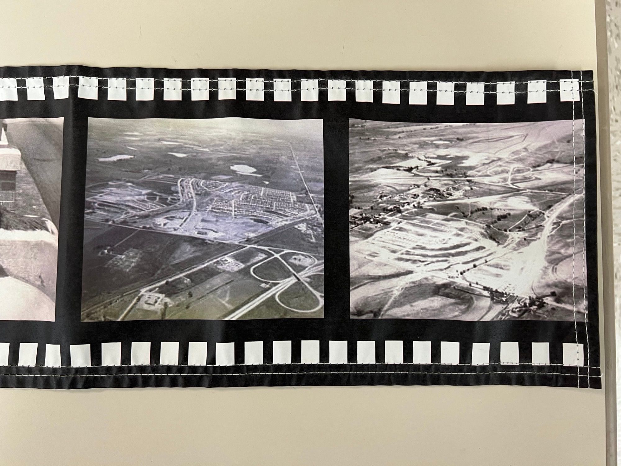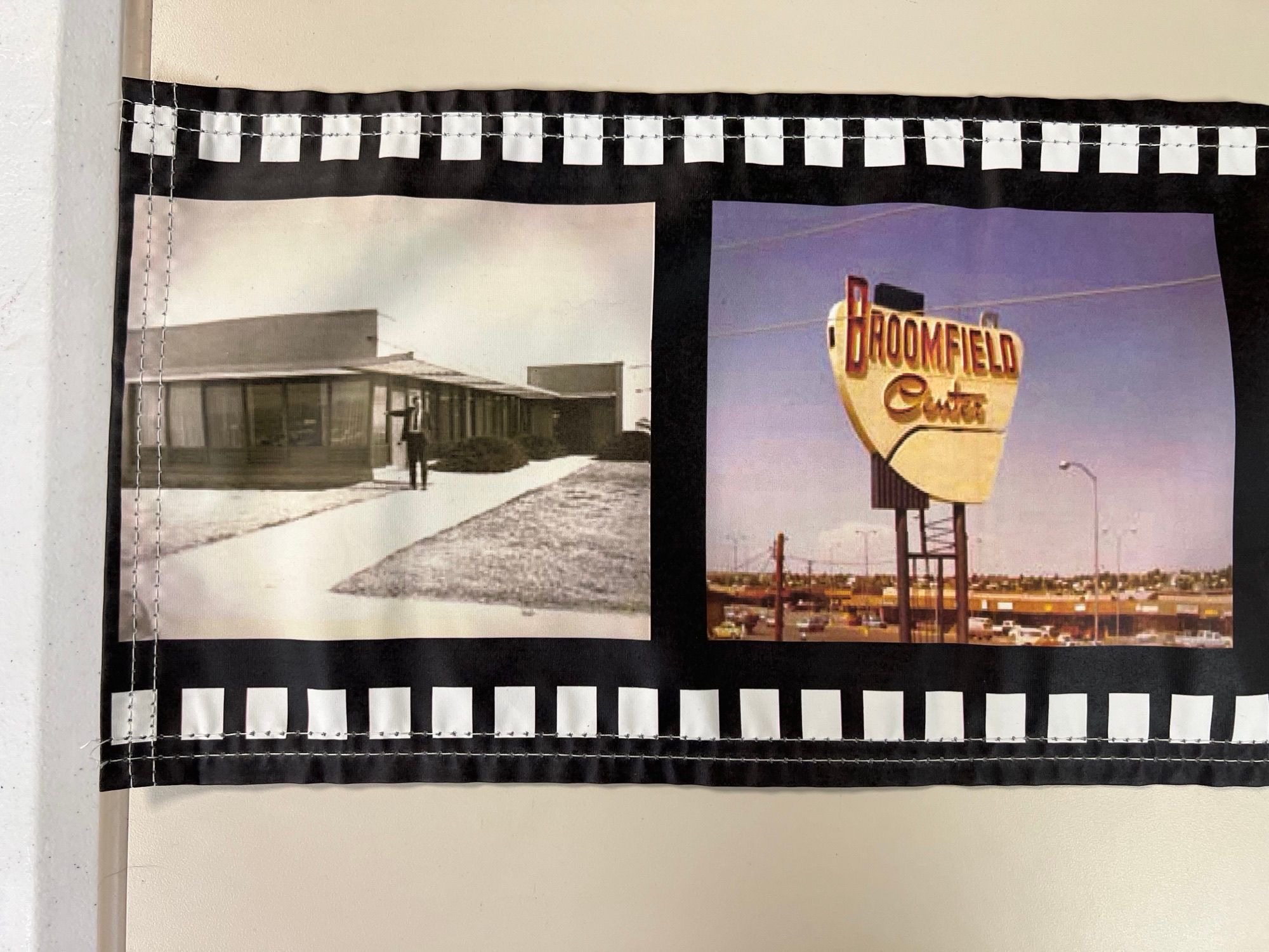 A polyester banner possibly made in celebration of Broomfield's 50th anniversary. It depicts various locations and people of Broomfield.
