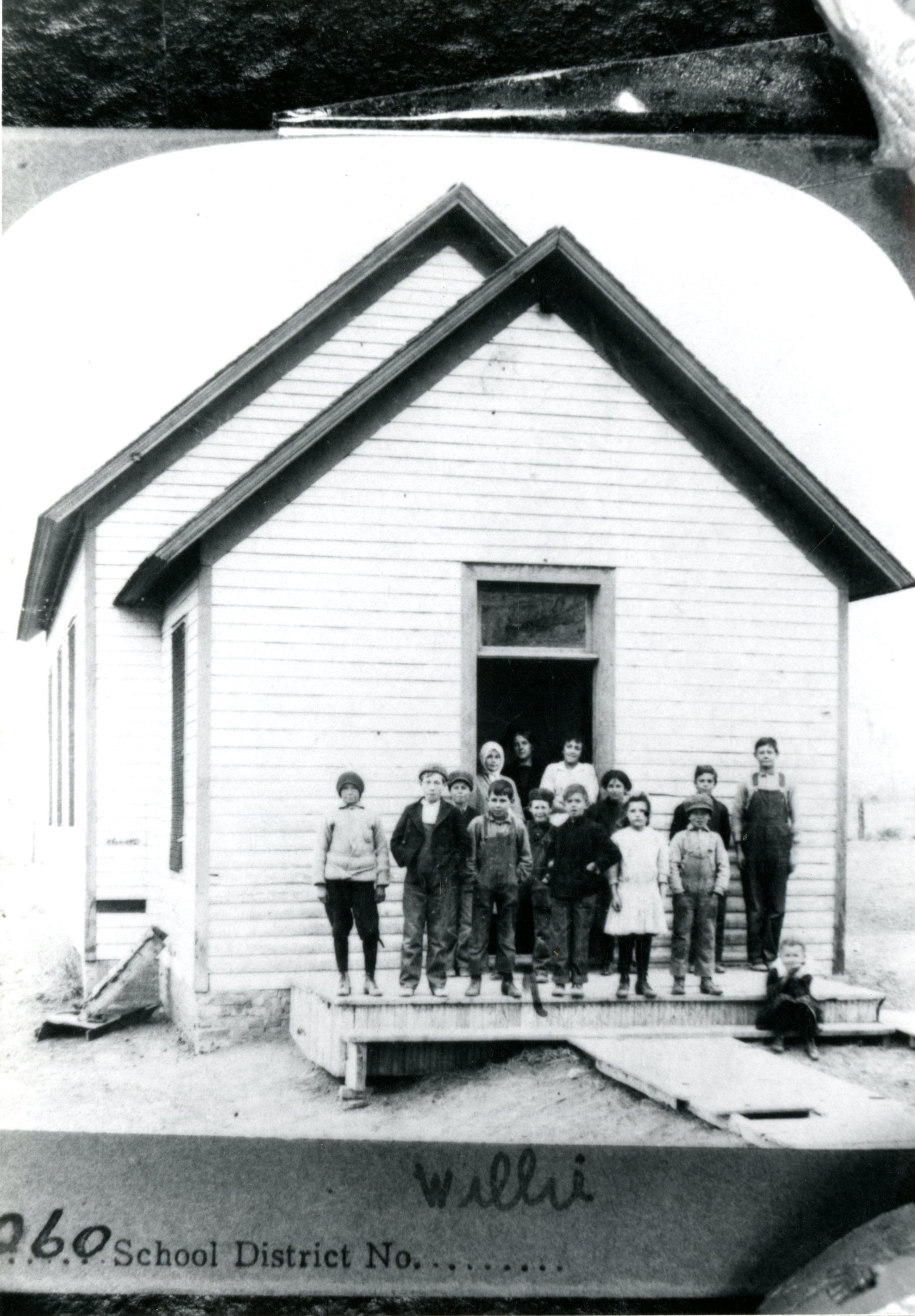Westlake School, possibly built 1880s. 14 people in photo, students with teachers in doorway. written on front: 260 School Dostrict No.. Willie.