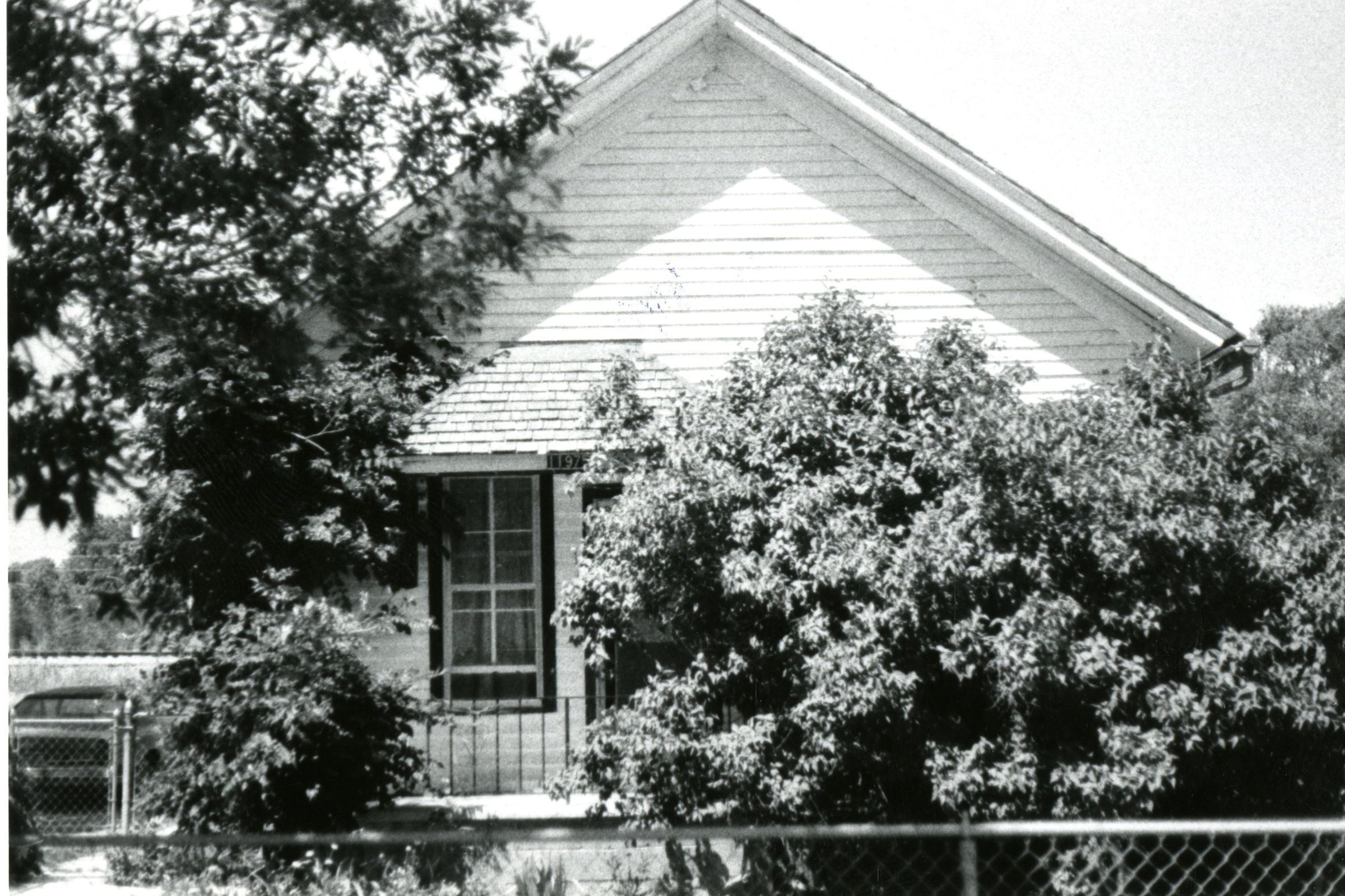 Old Broomfield School. was at 10th and Main, now 1175 Vance St. Trees and bushes on either side cover most of exterior. Small fence outside window. Car seen in lower left of photo.