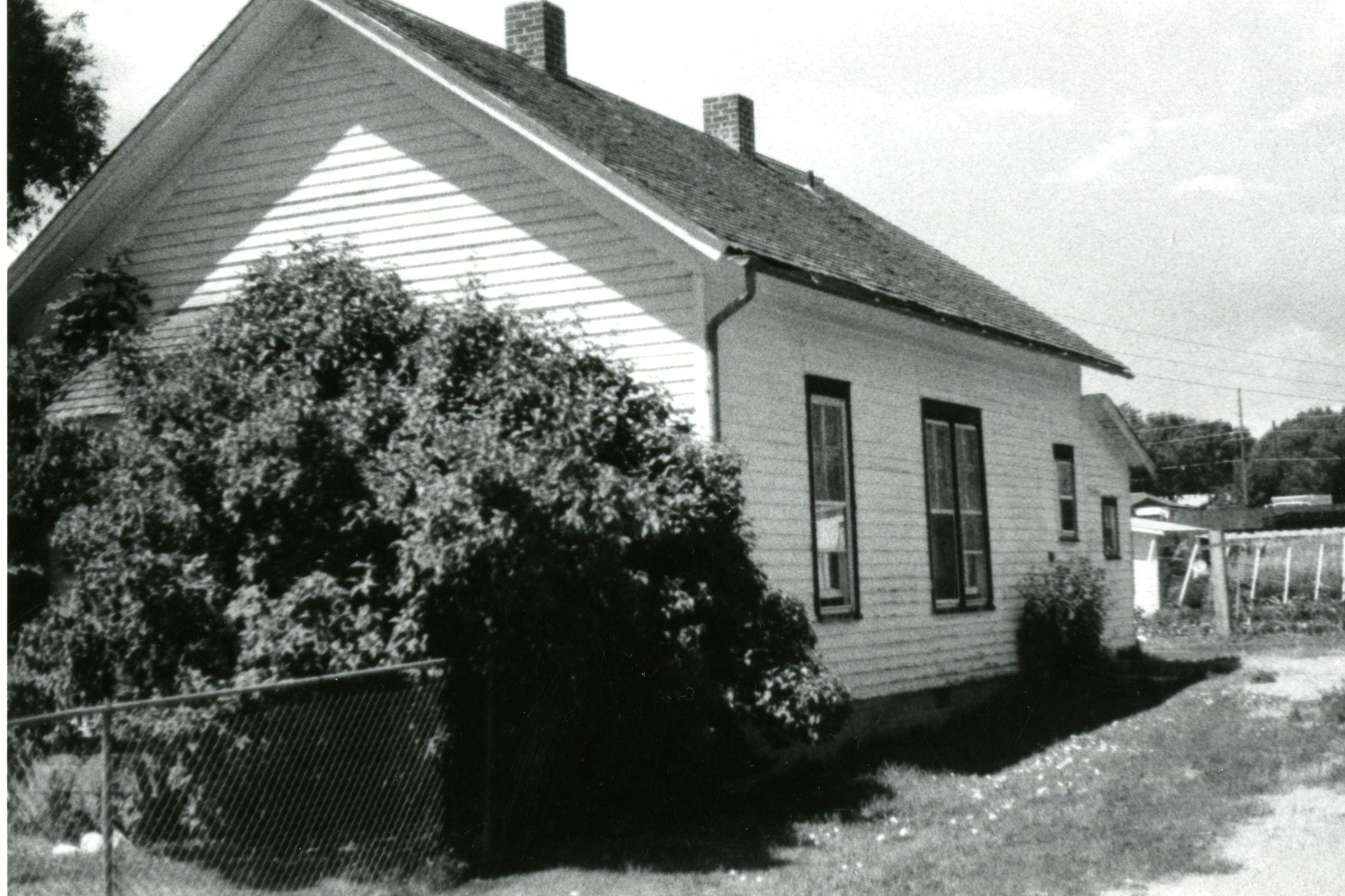 Old Broomfield School, was 10th and Main, now 11975 Vance St. Viewing back and side of Building. Trees covering back exterior. Storage and Fencing near back end to the right. 4 Windows showing.
