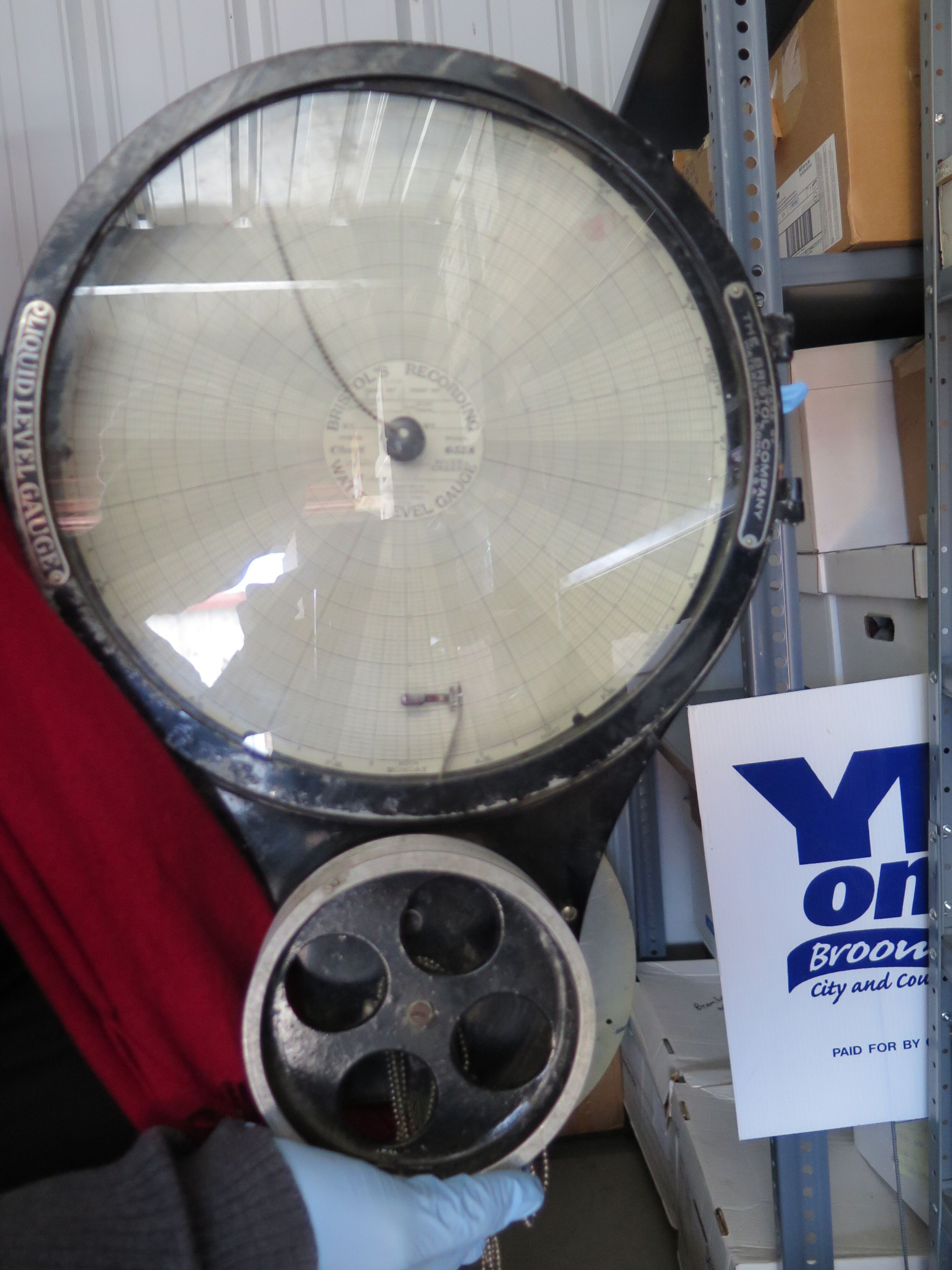 This is a Bristol's brand water level gauge. The gauge is black with a glass piece on the front that has a white analog display underneath it.