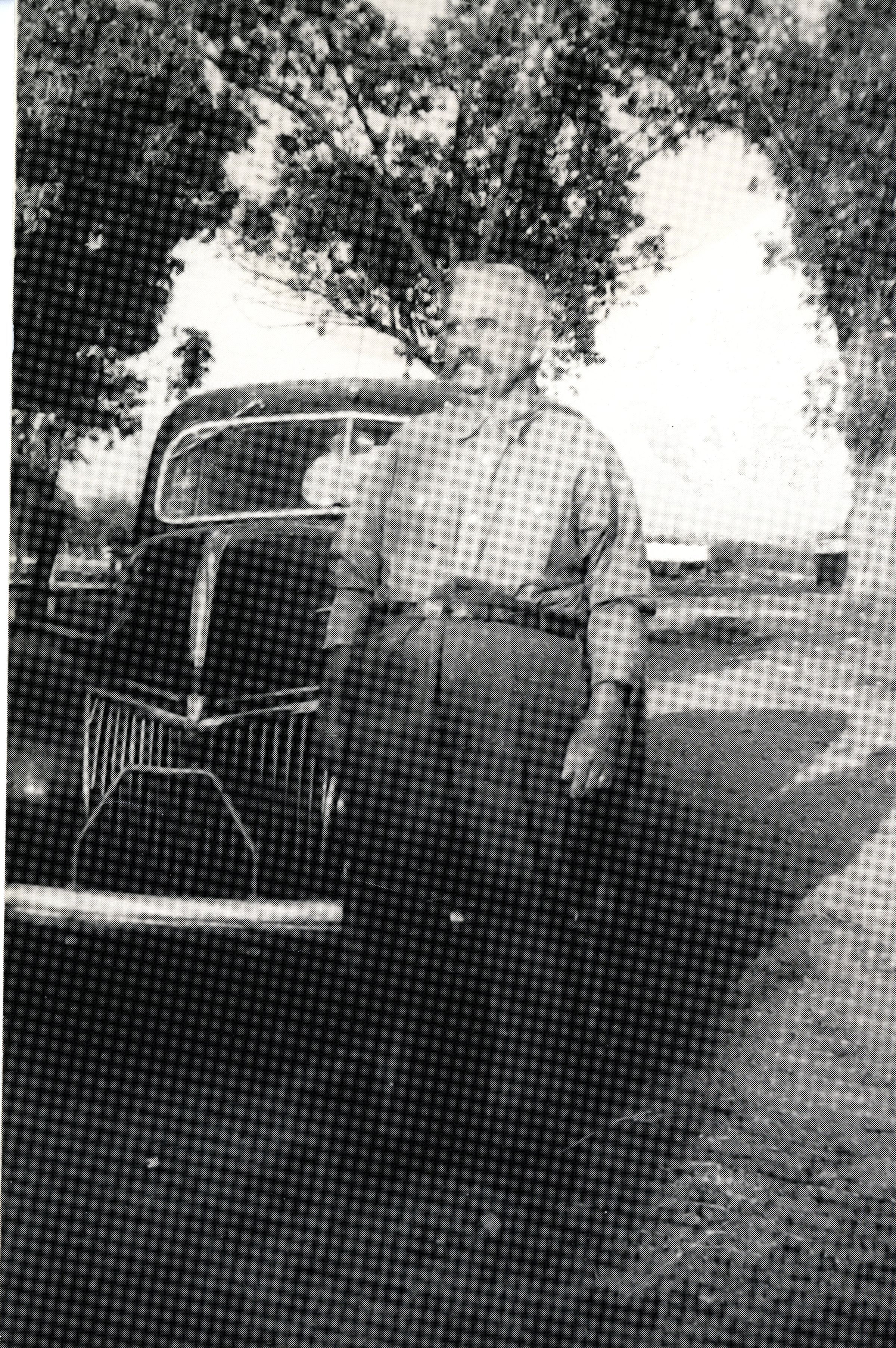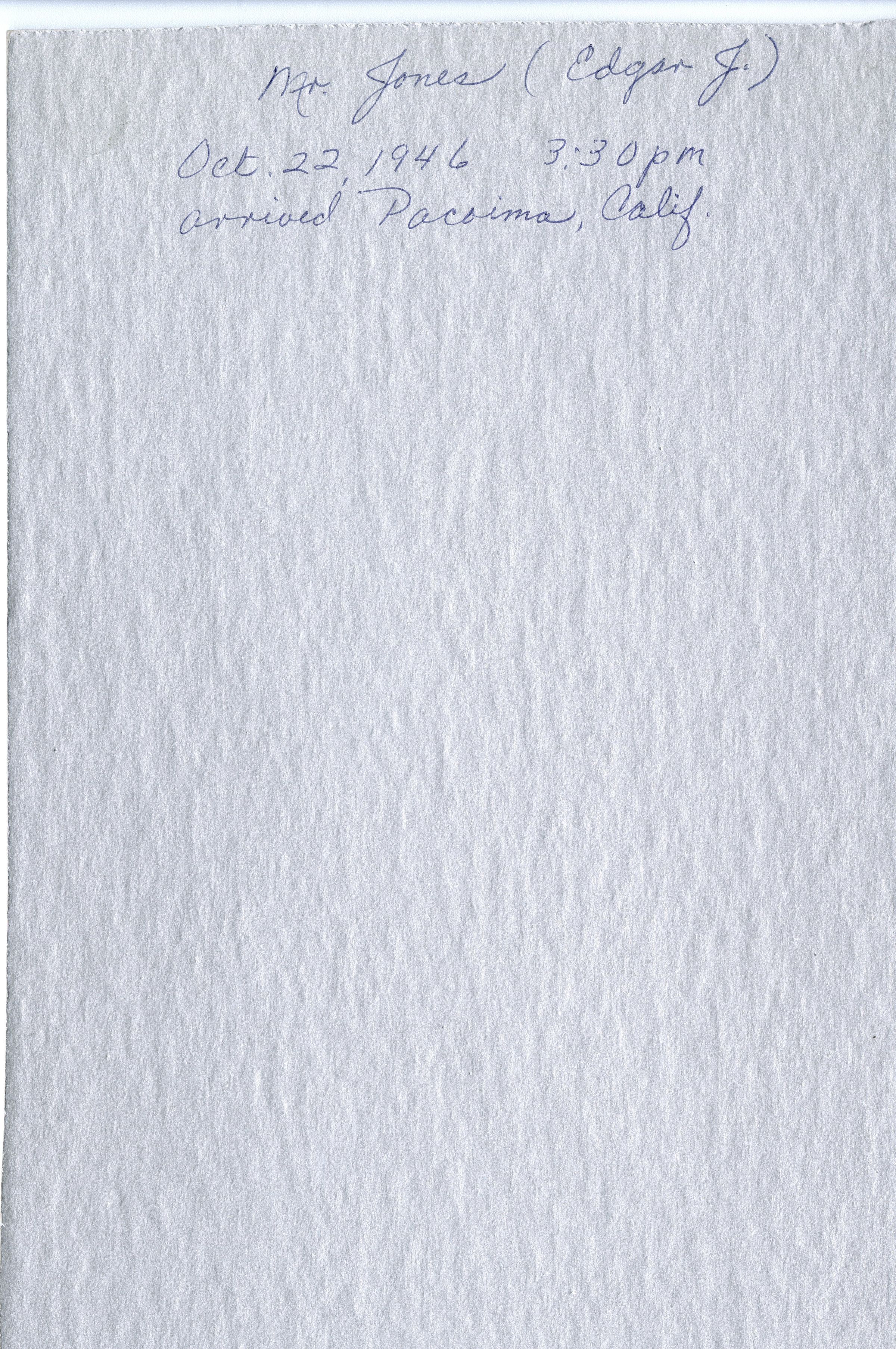Black and white photograph of an older man standing in front of a car in a clearing of trees. Information on the back of the photograph indicates that the man is a Mr. Edgar J. Jones and was taken on October 22, 1946 at 3:30pm either in or having arrived from Pacoima, California. Edgar Jones has a mustache and is wearing glasses, a lighter colored long sleeved button down and darker colored pants. Edgar J. Jones was appointed postmaster of Broomfield in 1901 and served as the postmaster until 1940 or 1941 according to a blog post made by the Fundus Funeral Home and Crematory.Collection