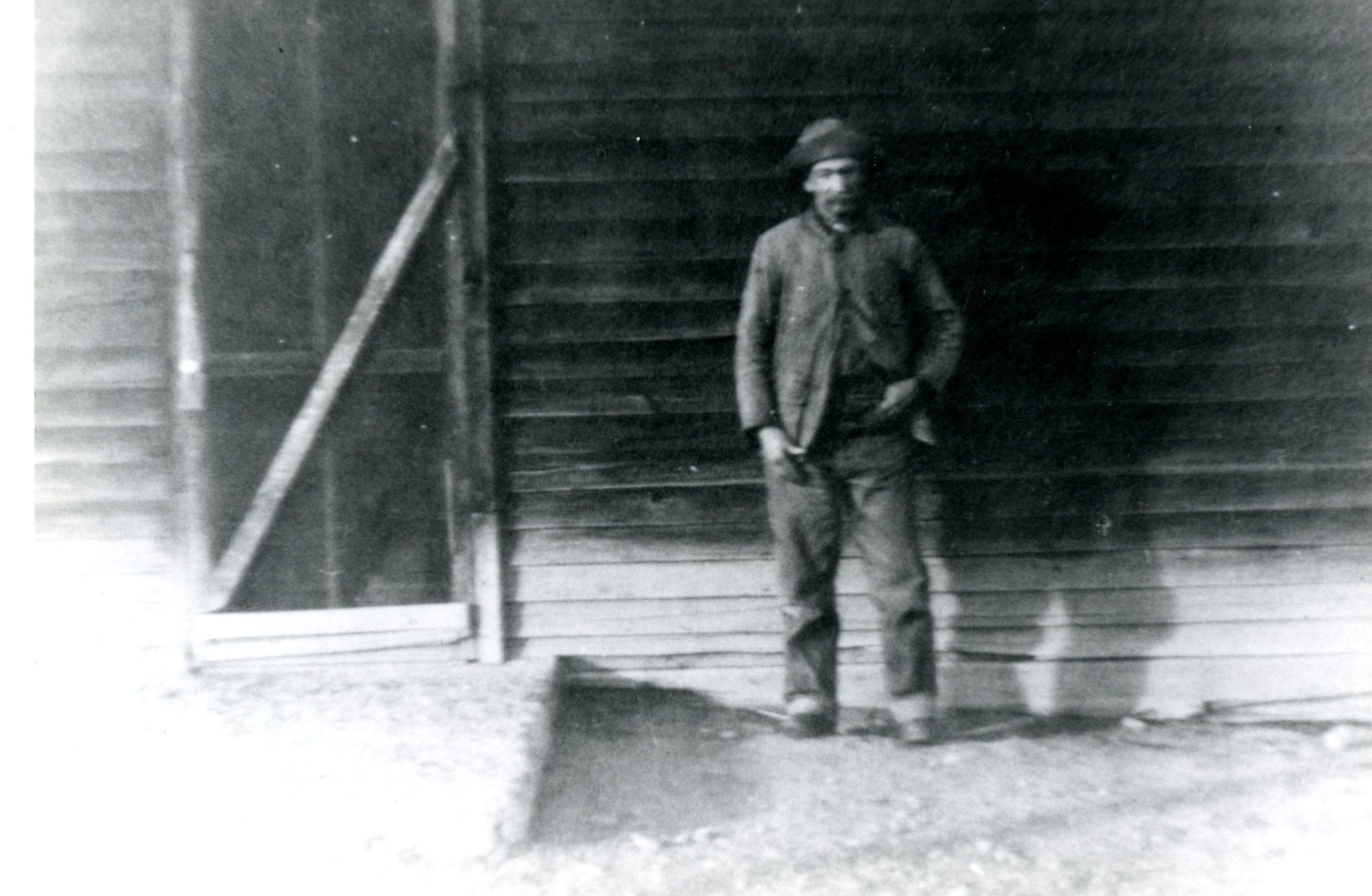 Photo of Viola Crook's father. Man standing in front of wood building.