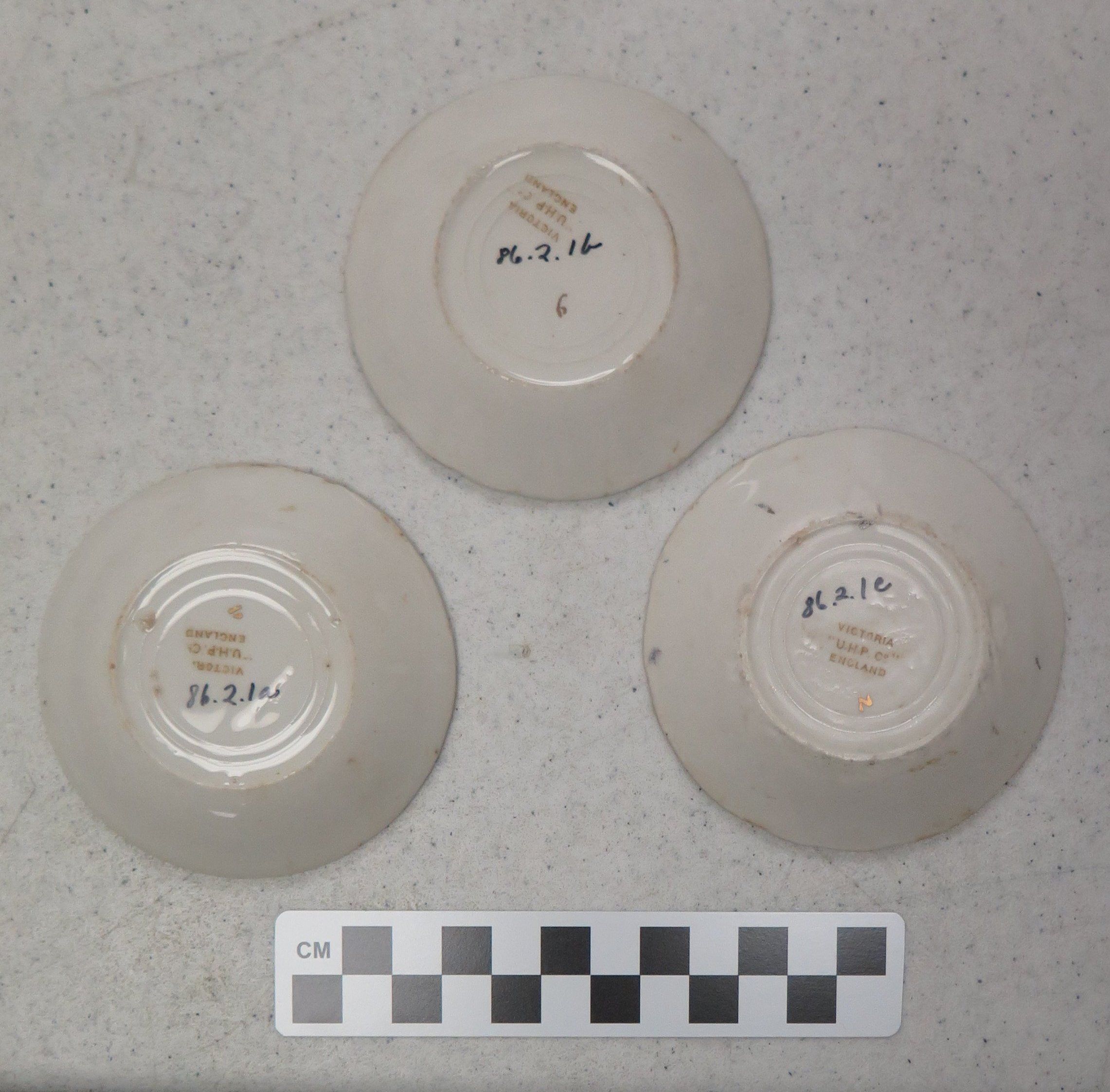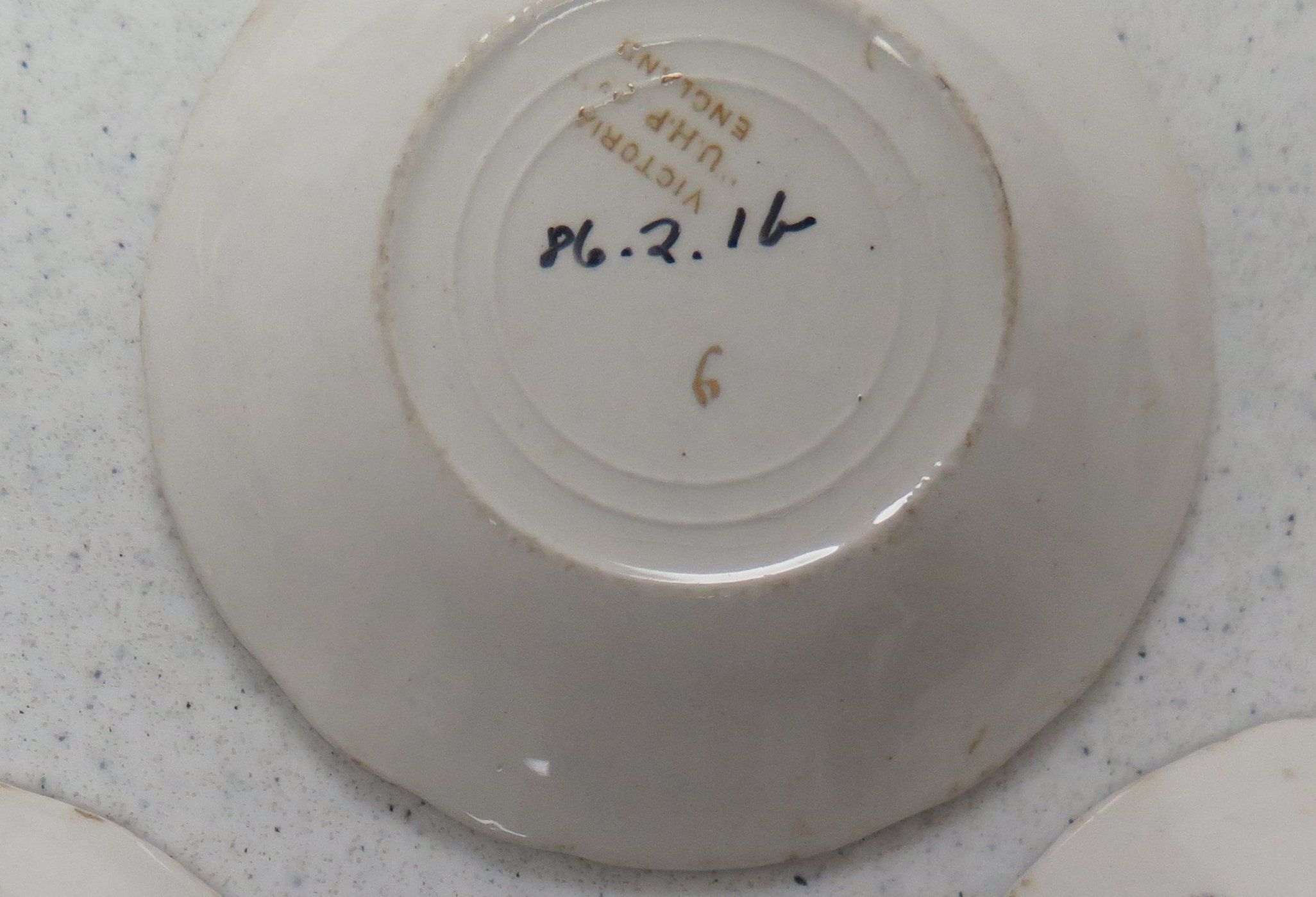This is a white ceramic butter pat dish measuring 3.25"(Dia). The dish has a gold pattern and the maker's mark on the bottom reads "Victoria 'U.H.P. Co.' England."