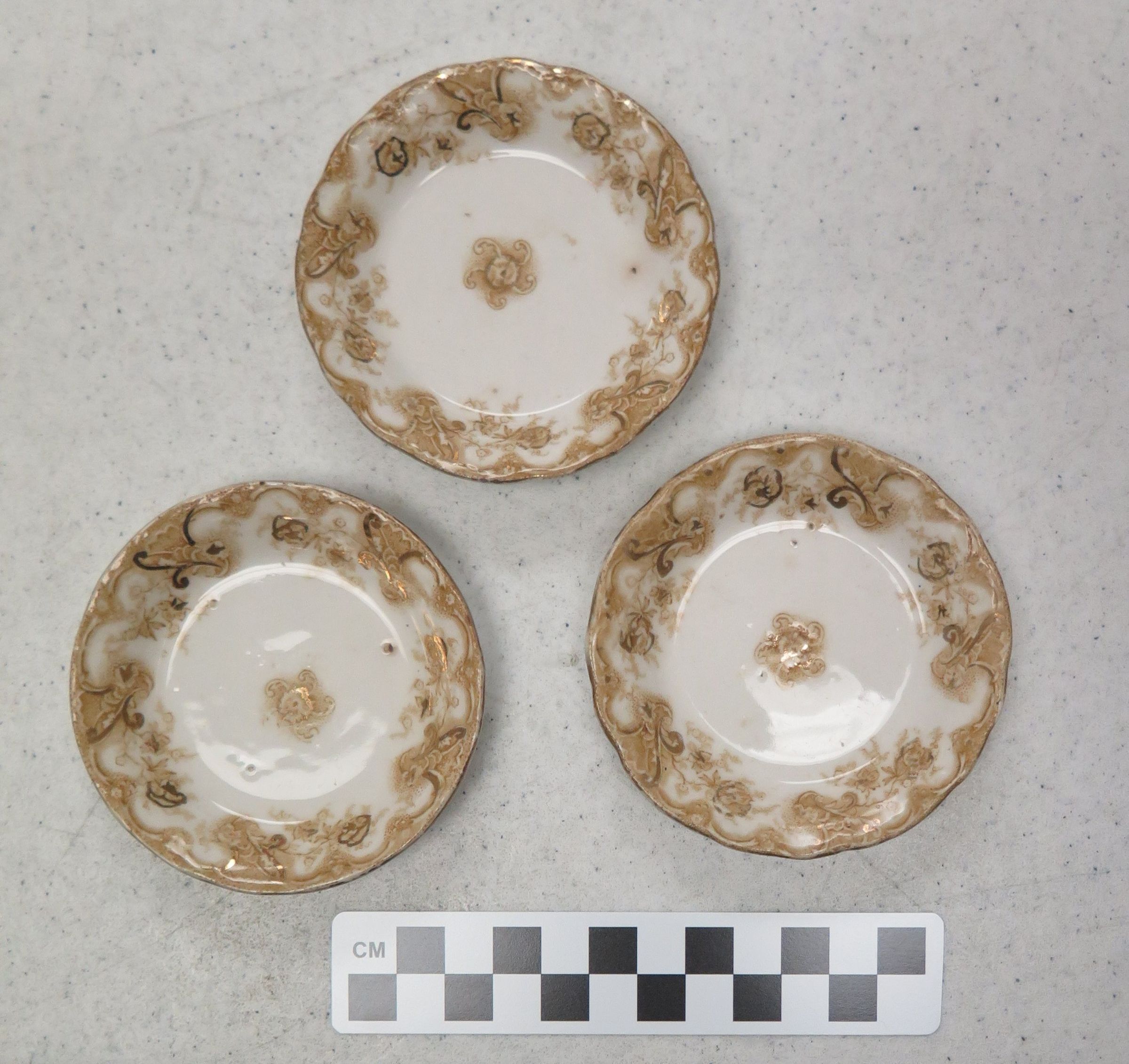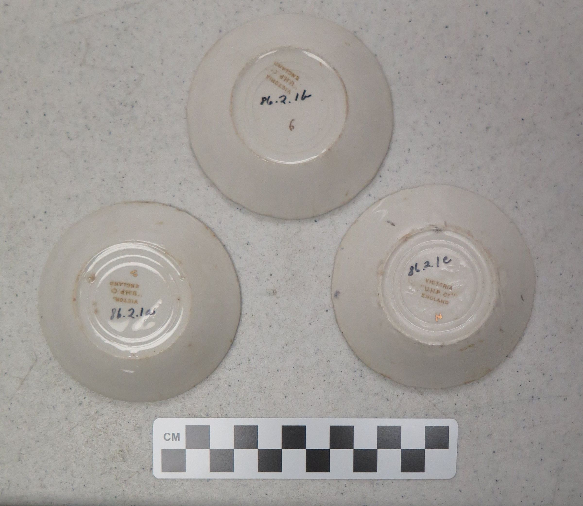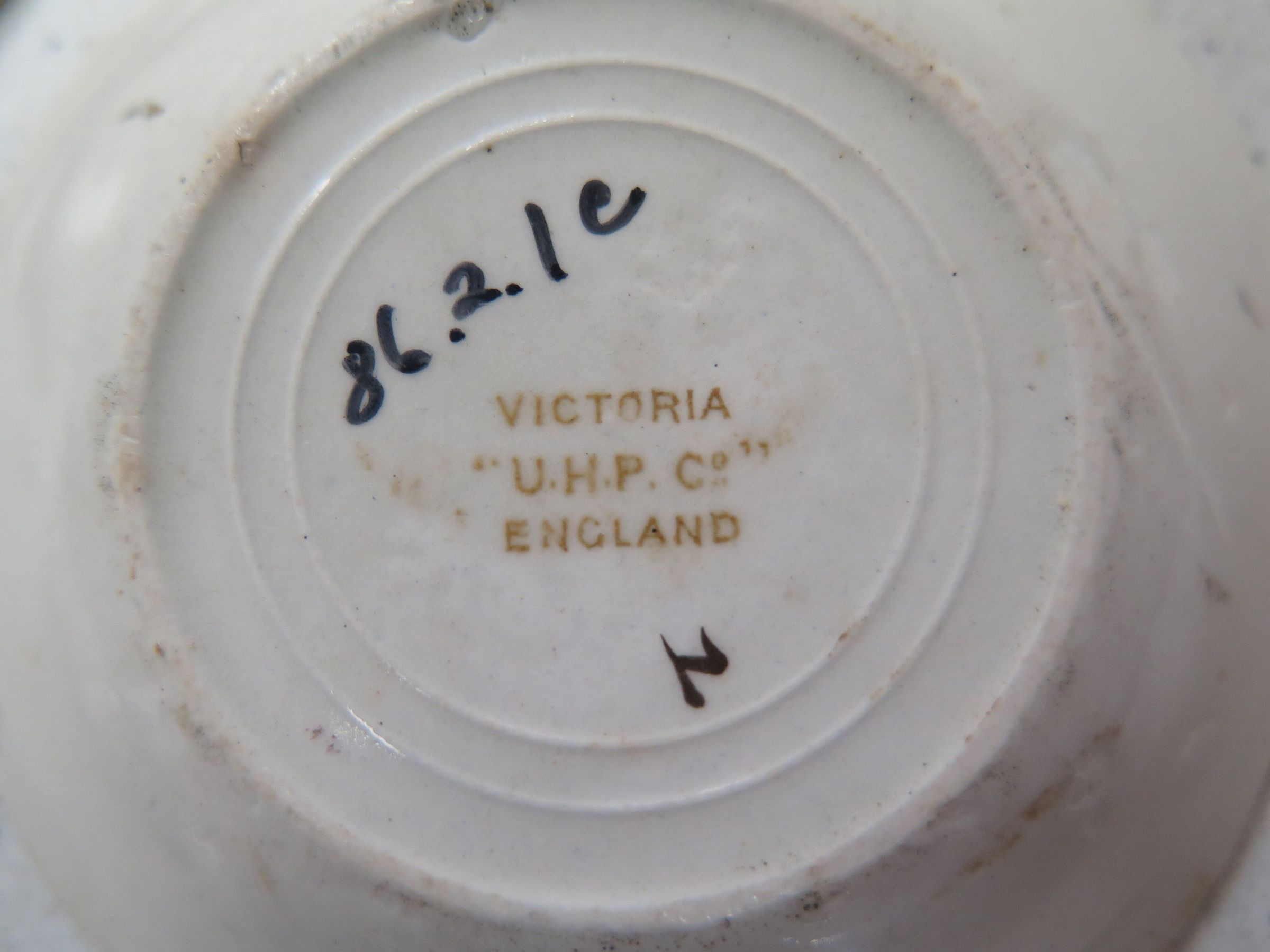 This is a white ceramic butter pat dish measuring 3.25"(Dia). The dish has a gold pattern and the maker's mark on the bottom reads "Victoria 'U.H.P. Co.' England."