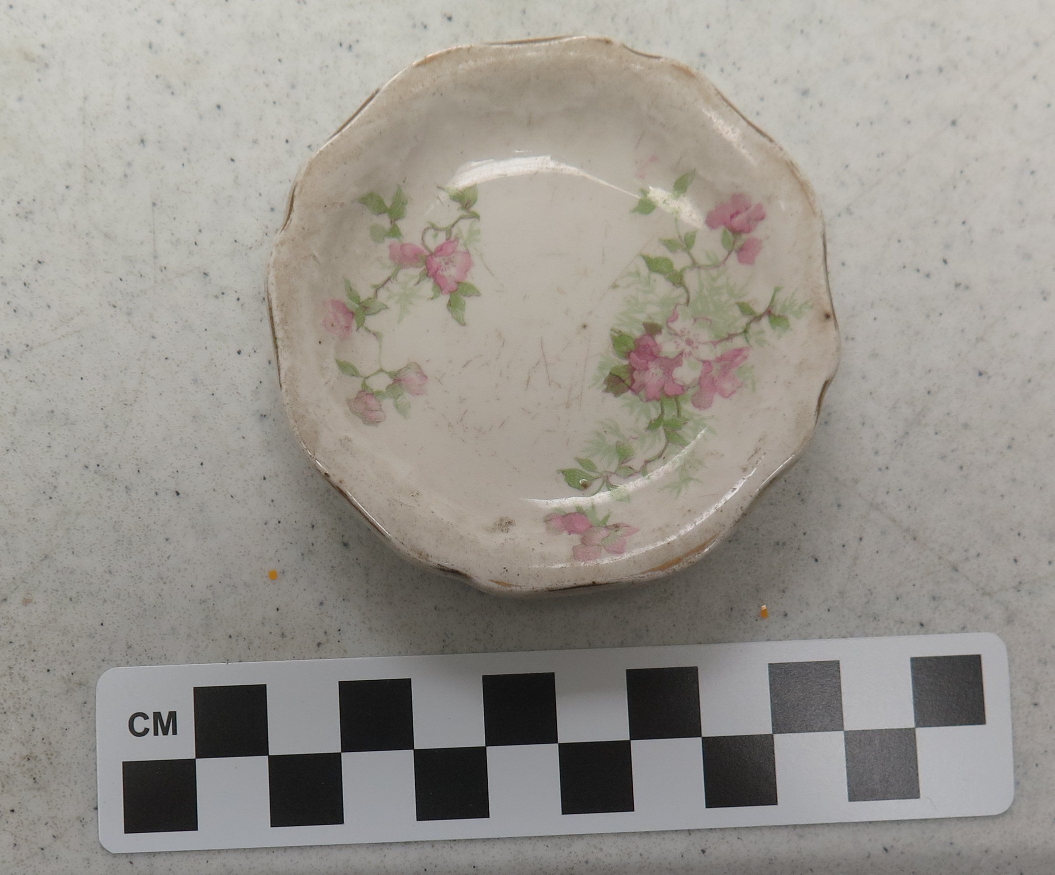 This is a white ceramic butter pat dish, measuring 3"(Dia), with painted pink flowers.