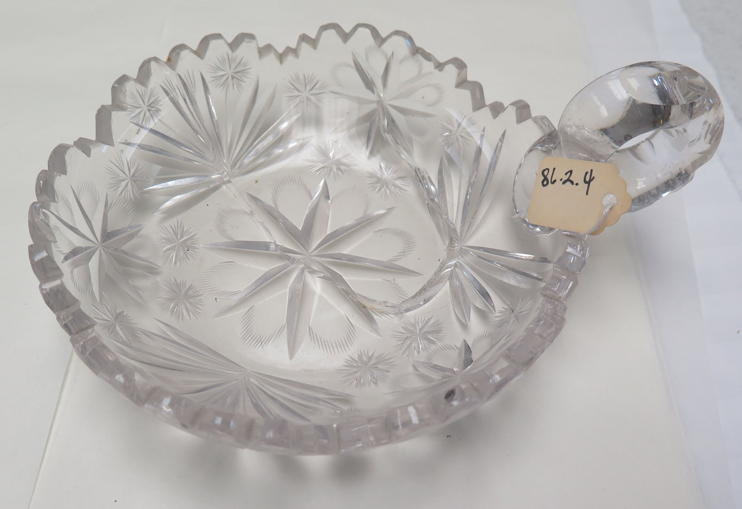 This cut glass round dish has a handle and a variegated edge. The dish is 1.75"(H) x 7.5"(W) x 5.75"(D). It is from the American Brilliant Period (ABP)--1870-1920. Trade names for this serving dish are "applied handle bon bon" or "applied handle nappie."