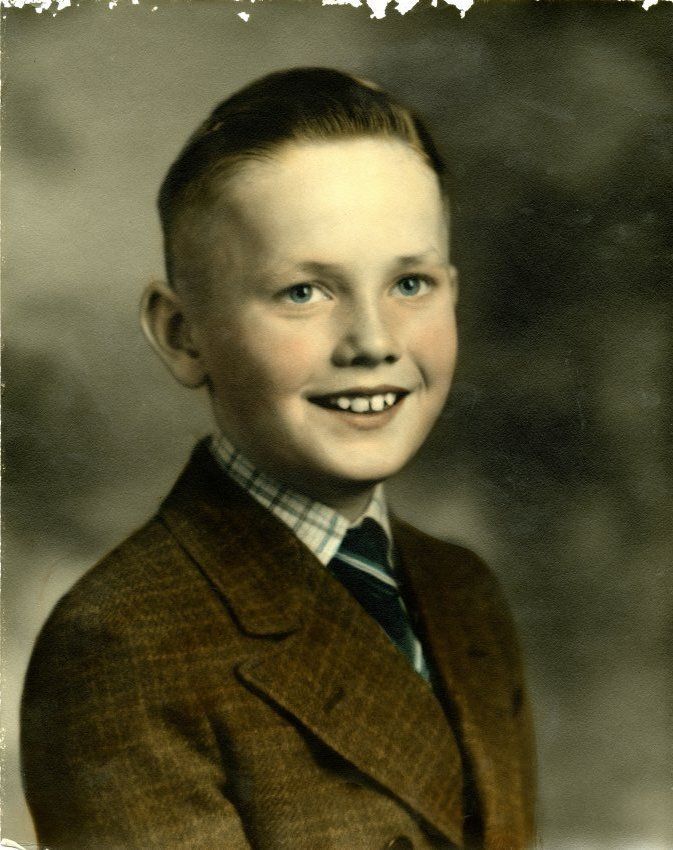 "Colorized" photo of John Huddart(?) as a young boy. Dress in jacket with shirt and tie. About nine years old.