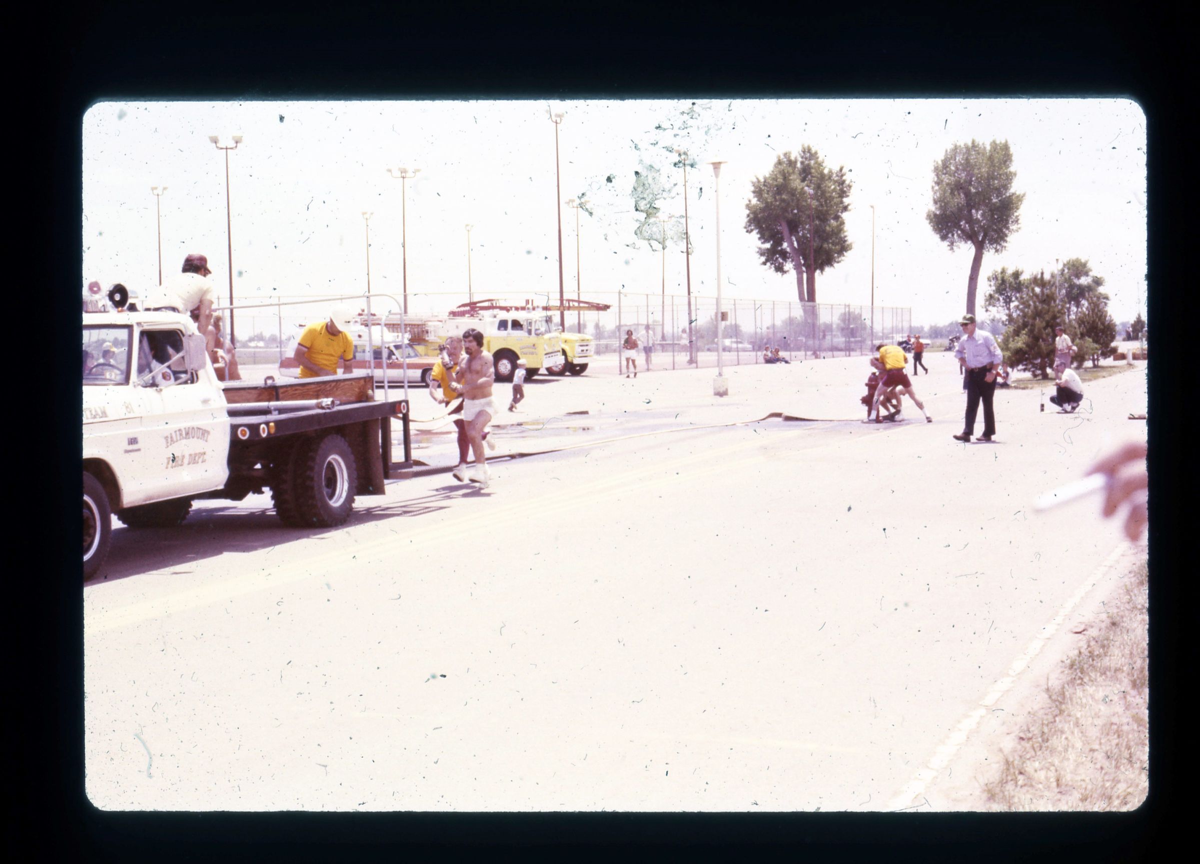 A color transparency depicting the West Adams County Fire Protection District Running Team at the 1976 Tri-County Field Day. Men are seen riding in and standing alongside a pick-up truck while onlookers watch from behind.