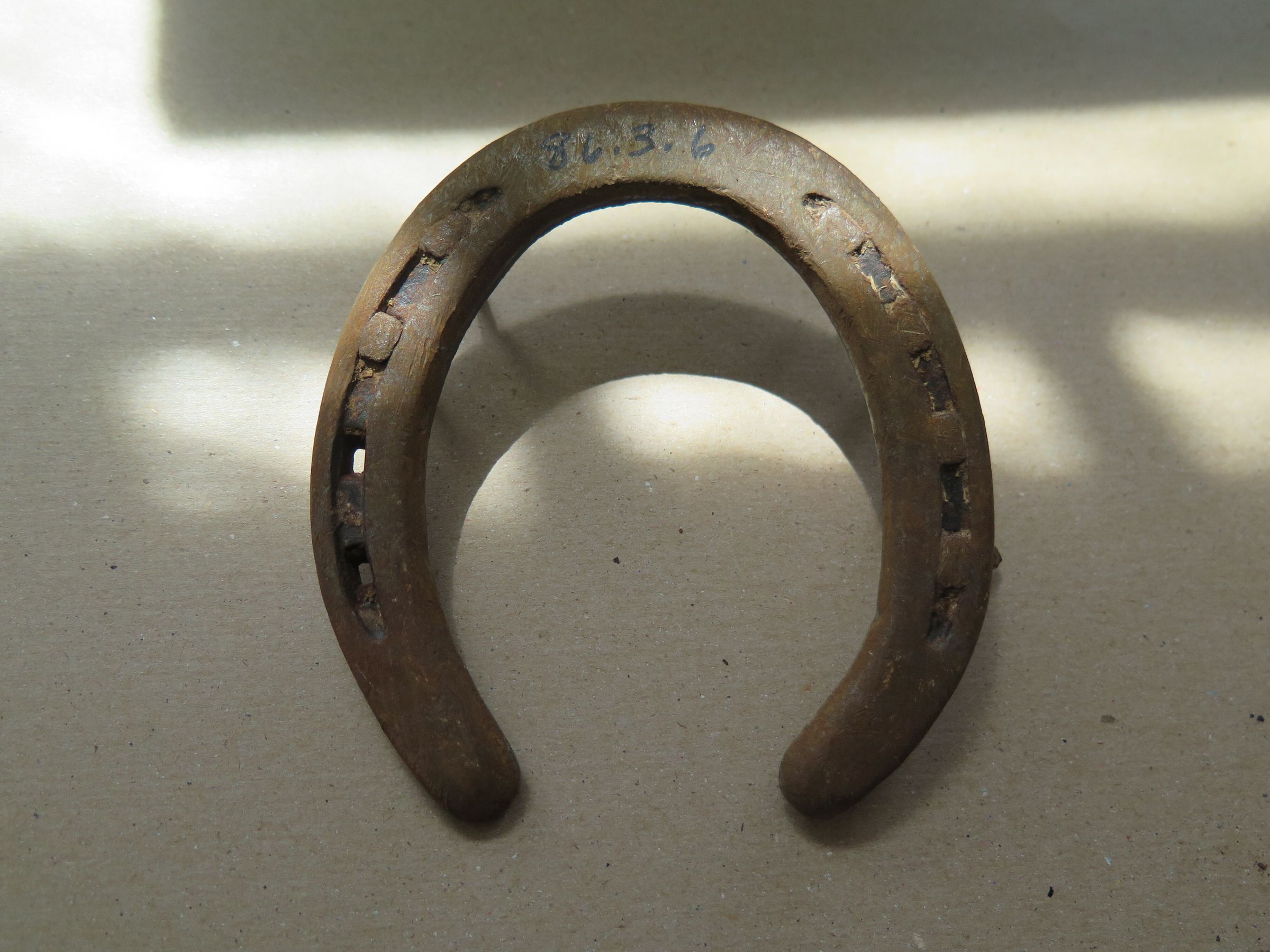 Metal horse shoe for riding horse. There are 6 nails sticking out of the horseshoe. The horseshoe measures 1" (h) x 4.25" (w) x 4.75" (l).