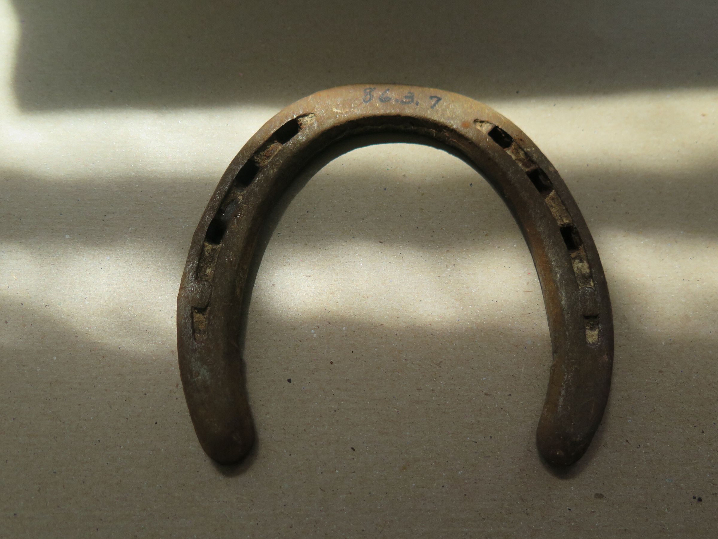 Metal horse shoe for riding horse. There are three holes on either side for nails but no nails in it. The horseshoe measures 0.25" (h) x 4.5" (w) x 5" (l).