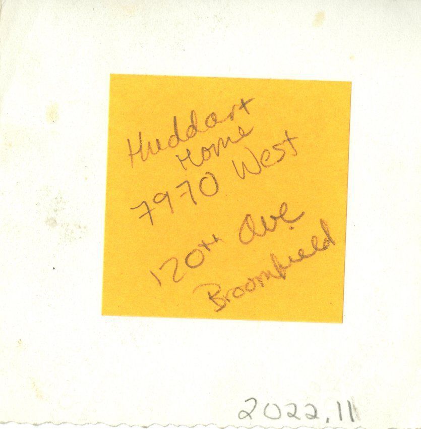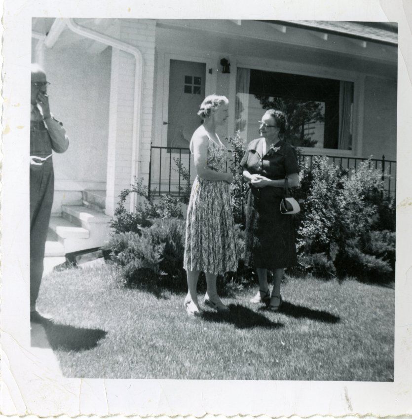 Small black and white photo of Lillian Huddart (?) talking with another woman, man in left side of photo. They are standing in a yard in front of a house. Back of photo has sticky note that says "Huddart home, 7970 West 120th Avenue, Broomfield".Collection