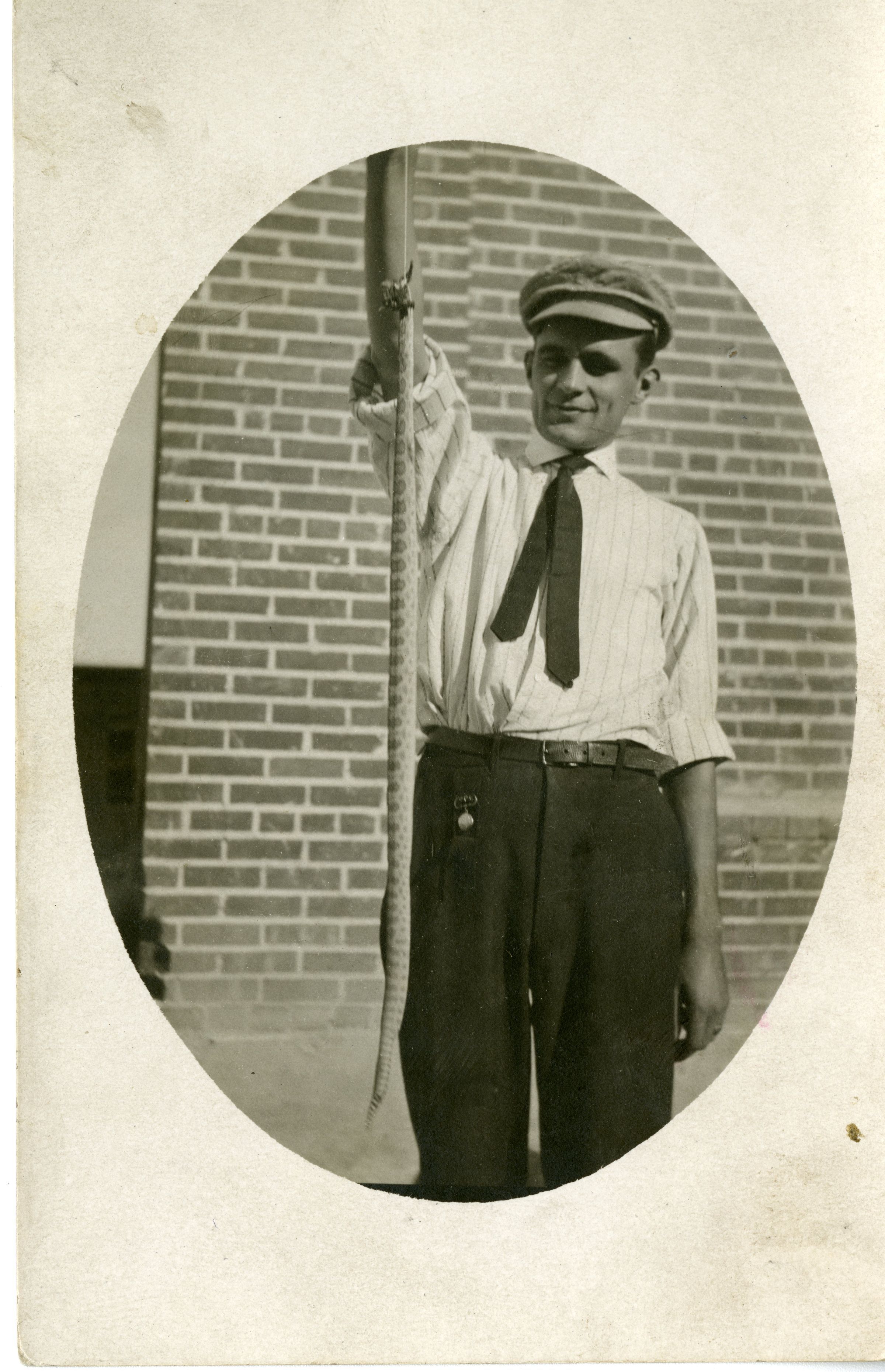 Black and white photo of man standing in front of brick wall holding a dead rattlesnake. He is dressing in slacks, white shirt and tie with cap. Back of card is unwritten on and says "Post Card." Possible connection to Joe Huddart, as this photo was found at his house.