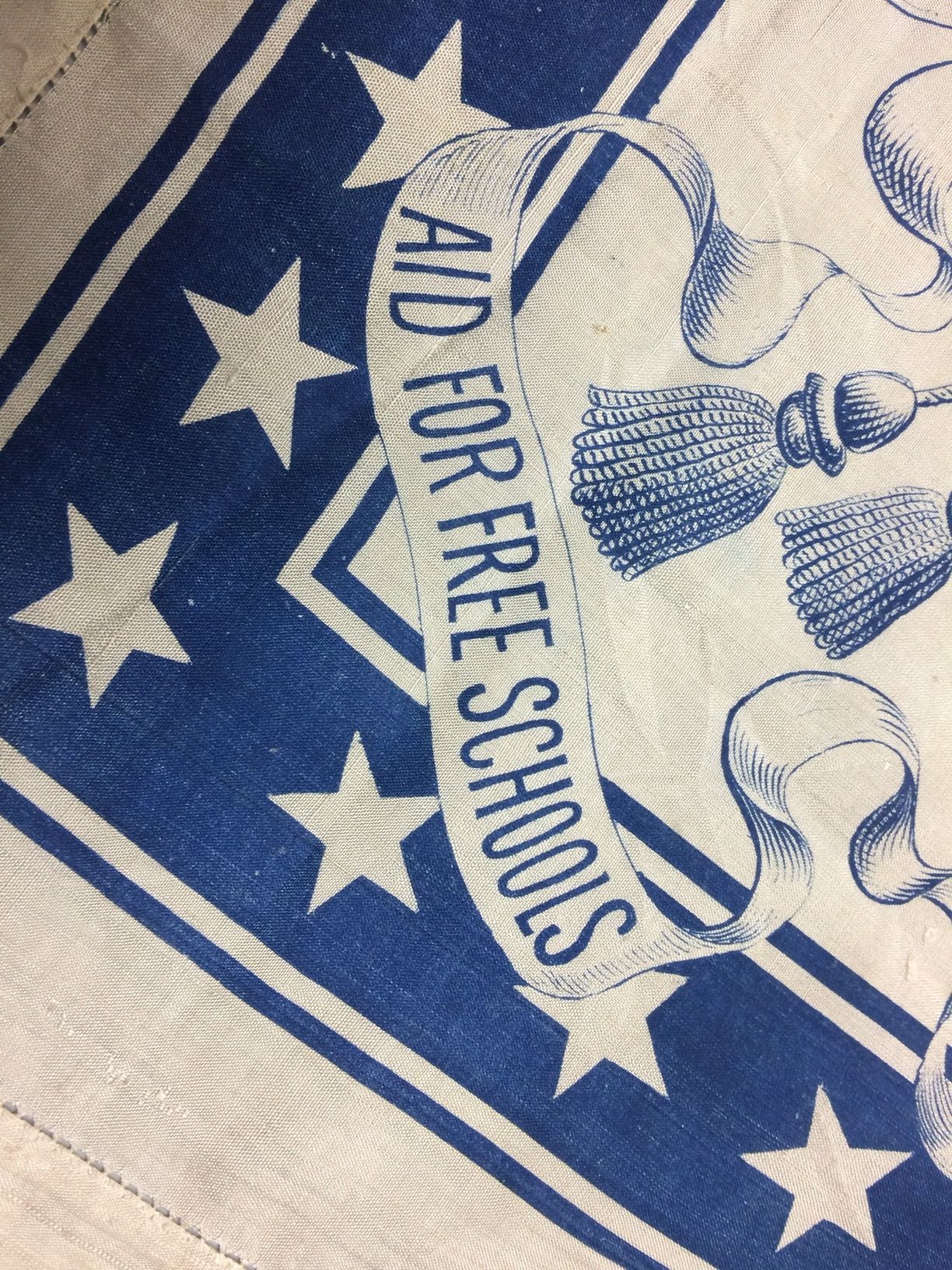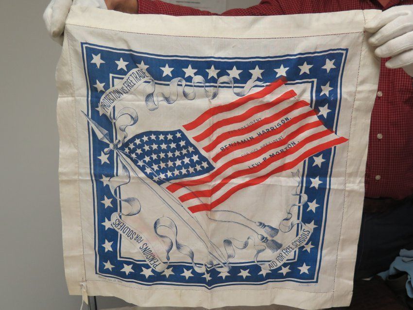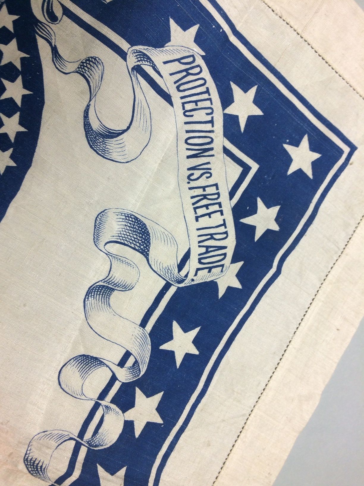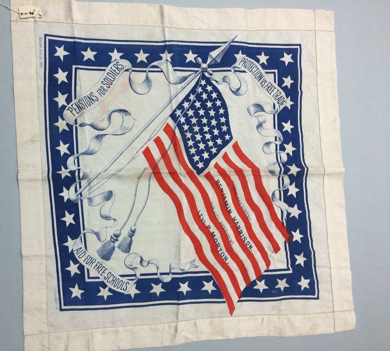 This is handkerchief/scarf promoting Benjamin Harrison and Levi Morton for president and vice-president of the United States of America in the elections of 1888. The handkerchief is white fabric. There are boarders of blue stars and white ribbon. In the center is a red, white, and blue American flag. In the top corner it says, "PROTECTION VS. FREE TRADE." In the bottom corner it says, "AID FOR FREE SCHOOLS," and in the left corner it says, "PENSIONS FOR SOLDIERS." The scarf measures 20" (w) x 20.5" (l).Collection