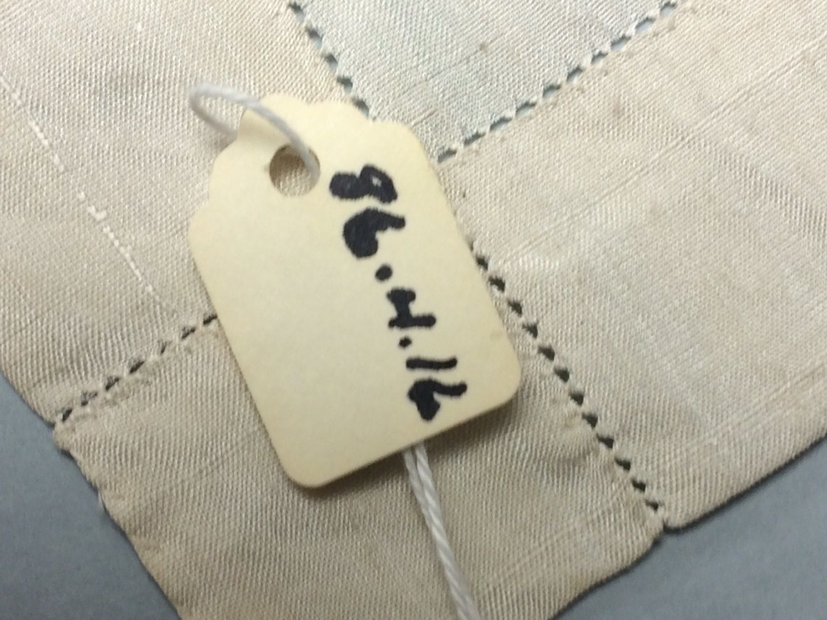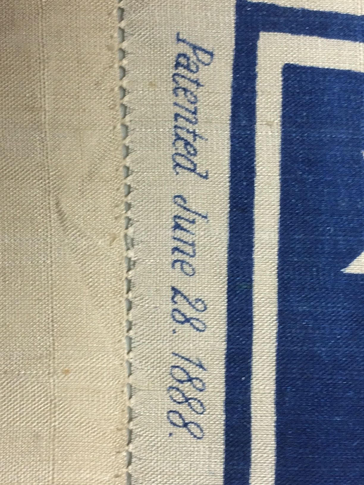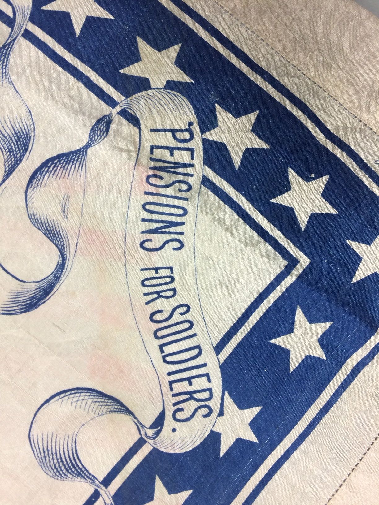 This is handkerchief/scarf promoting Benjamin Harrison and Levi Morton for president and vice-president of the United States of America in the elections of 1888. The handkerchief is white fabric. There are boarders of blue stars and white ribbon. In the center is a red, white, and blue American flag. In the top corner it says, "PROTECTION VS. FREE TRADE." In the bottom corner it says, "AID FOR FREE SCHOOLS," and in the left corner it says, "PENSIONS FOR SOLDIERS." The scarf measures 20" (w) x 20.5" (l).Collection