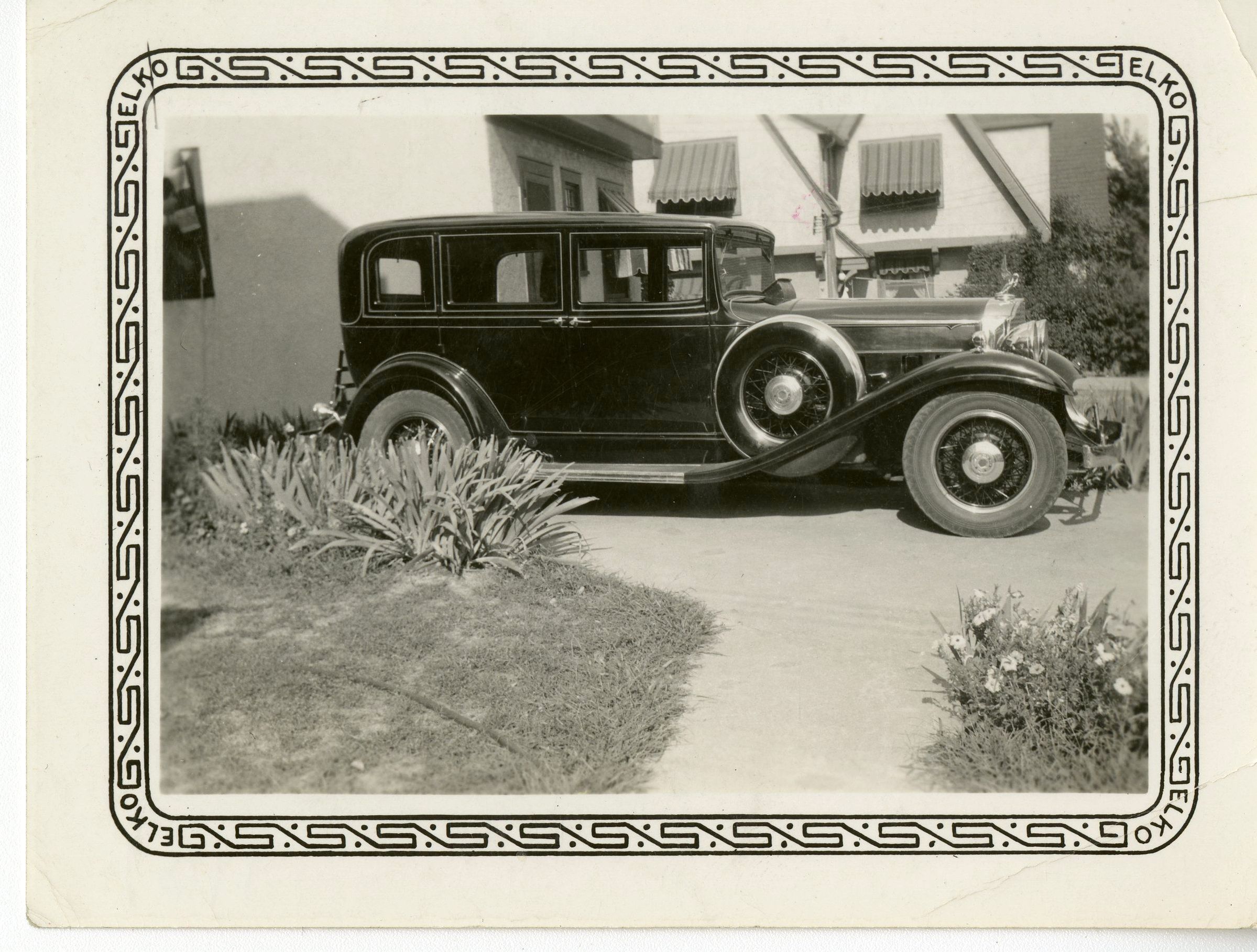 This is a Black and white photograph that features a Studebaker or Packard car. The car is in a driveway in front of a stucco house (possibly taken in California). The car features a spare tire on it's right side above the front right wheel hub. Flowers are shown next to the sidewalk in the right side of the photo and the car is facing the right side also. along the edge is a border that has a boxy design with the words ELKO in every corner.Collection