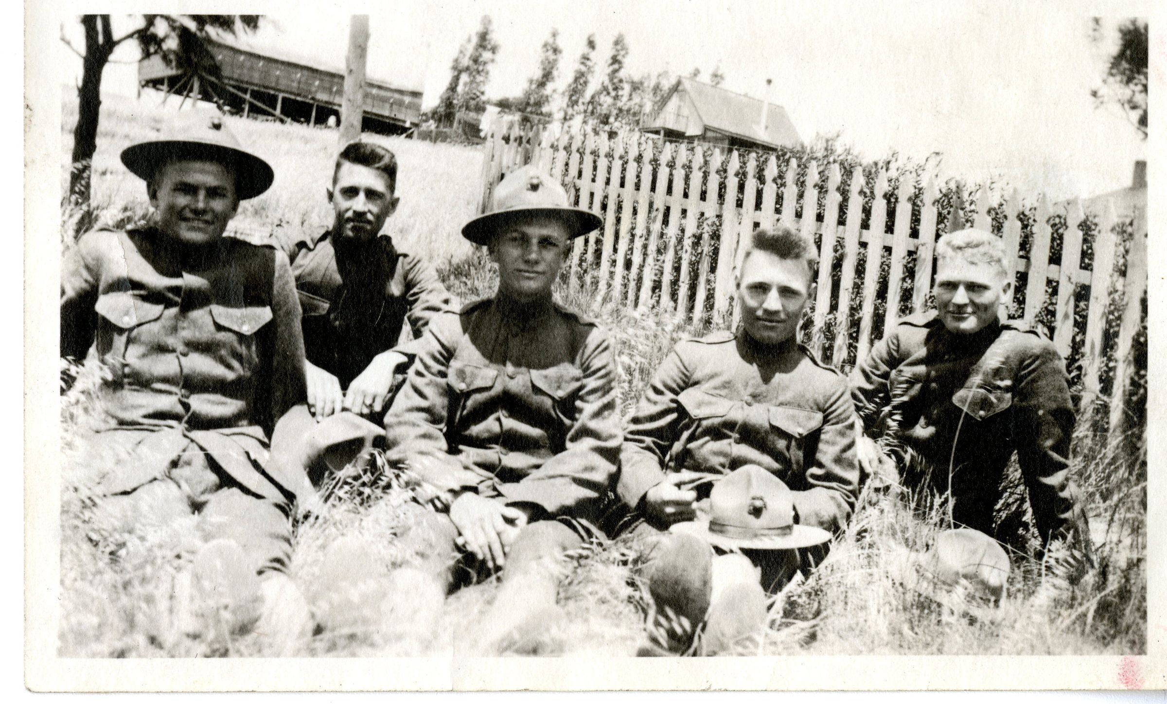 Black and white photo of five men in WWI Army uniforms. They are sitting on the ground in front of a picket fence. Two are wearing military hats. It is suspected that one of these men may be John Huddart. Photo found in his house in 2022.